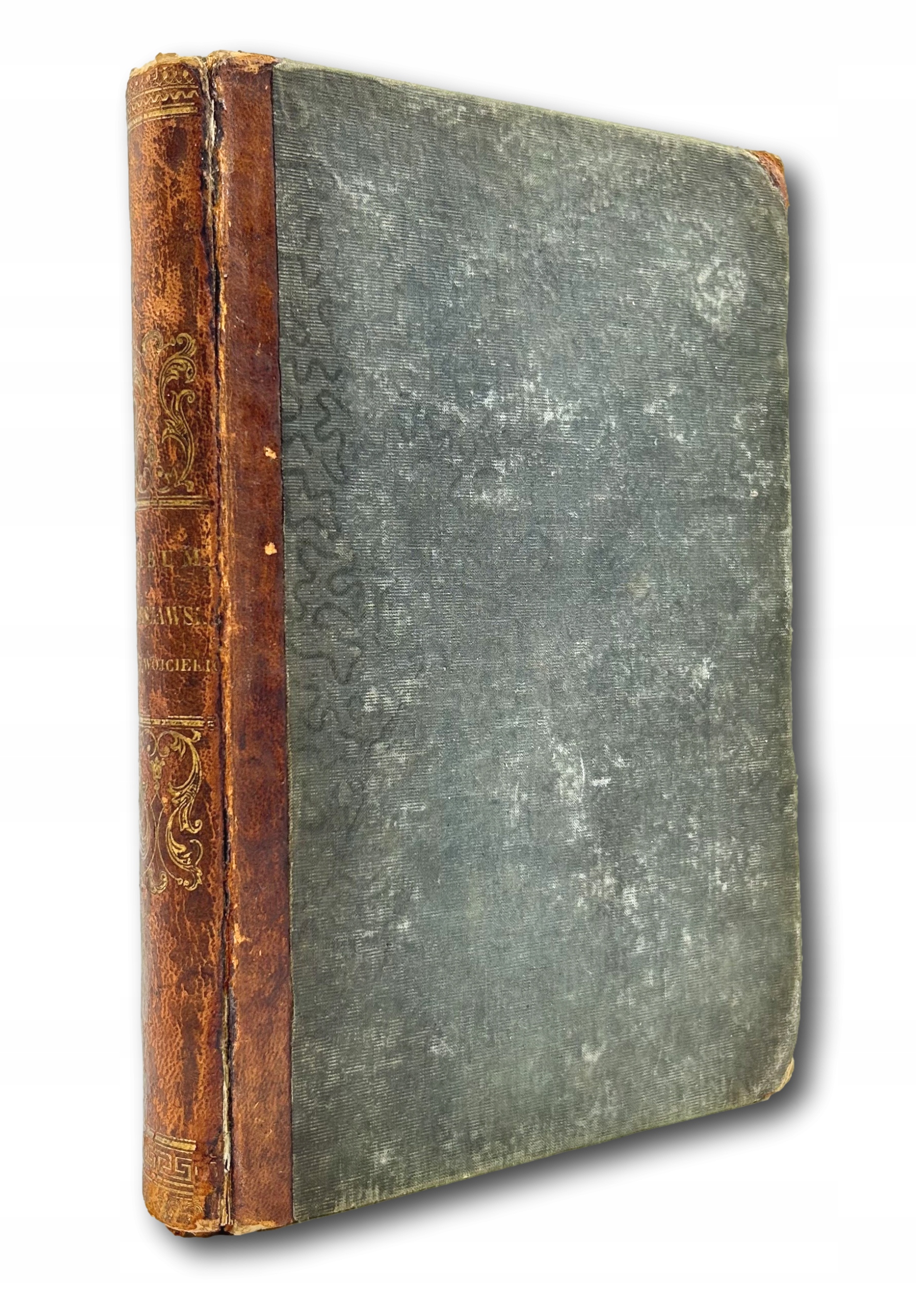 Oprawa: introligatorska w półskórek, złocona tytulatura na grzbiecie oraz charakterystyczne dla epoki zdobienia