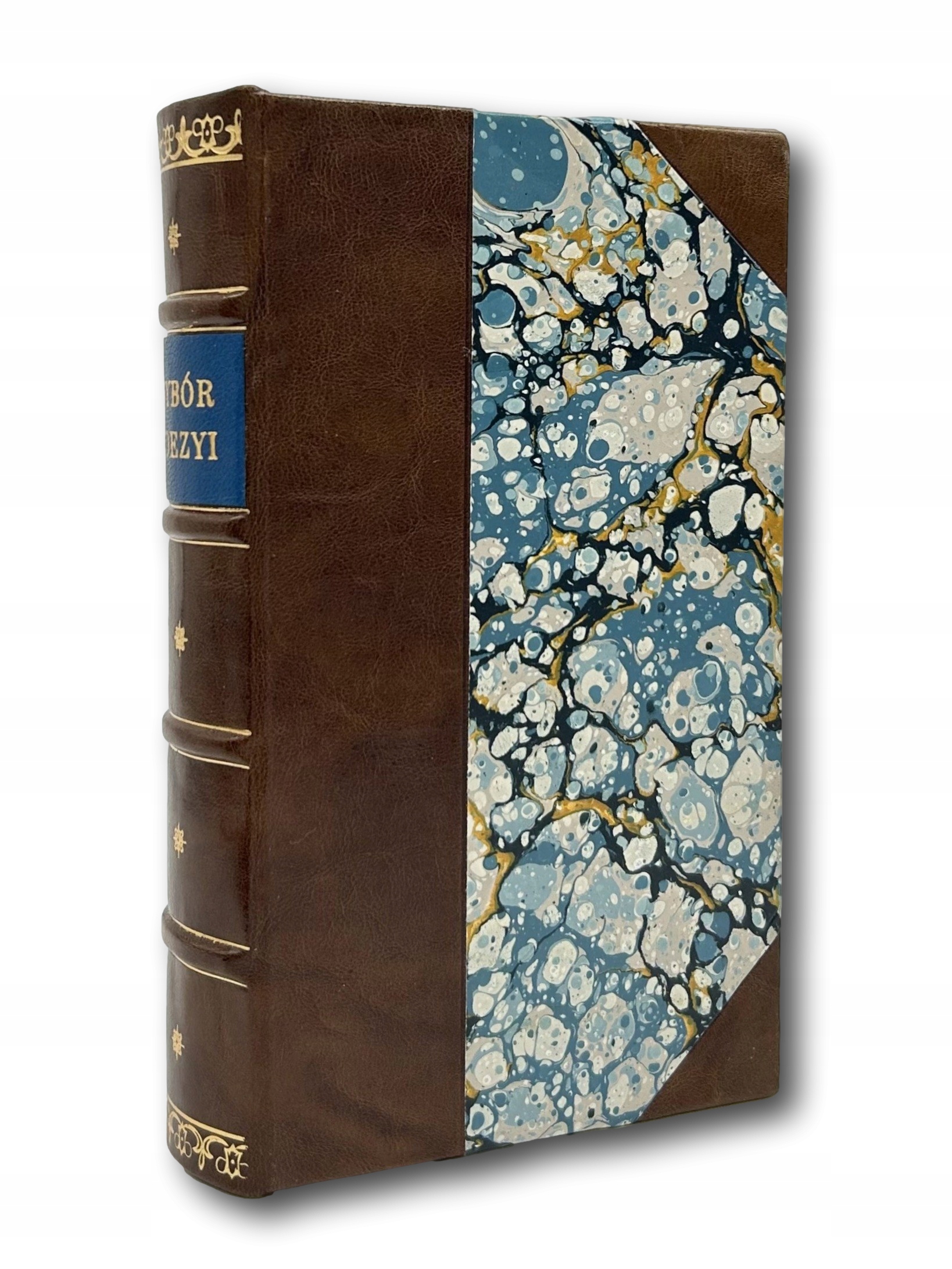 Oprawa: Oprawa introligatorska w brązowy półskórek. Grzbiet podzielony na sześć pól, w jednym niebieski szyldzik ze złoconą tytulaturą, w pozostałych złocona rozeta, zwięzy u dołu i góry podkreślone złoconymi liniami; papier okładek marmurkowy; nakrapiane obcięcia kart.