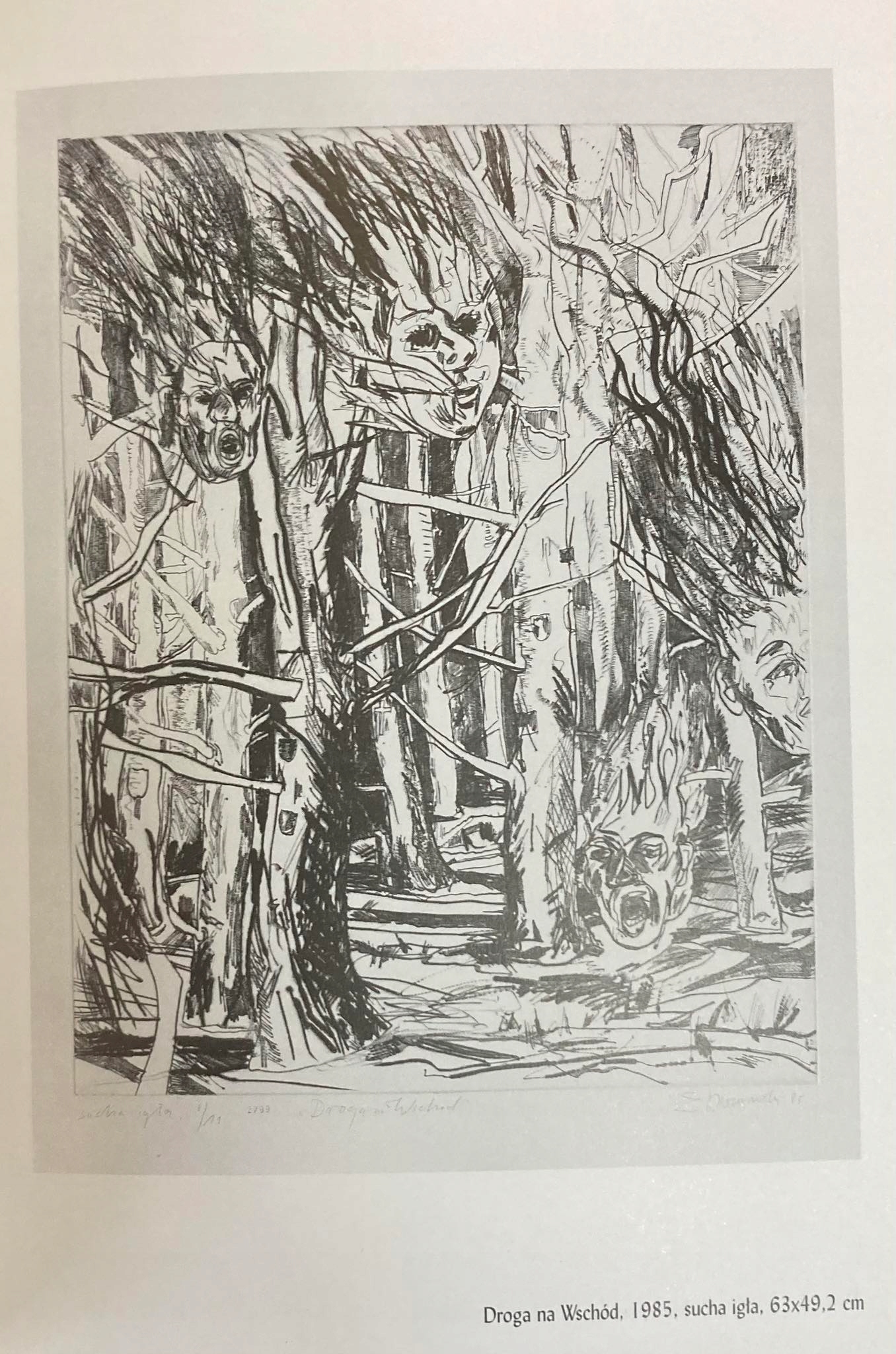„Dwurnik w serii grafik z lat 80-tych posłużył się metalowymi technikami, takimi jak akwaforta i sucha igła, które dobre odpowiadają ekspresjonistycznemu charakterowi prac. Poszarpana linia suchej igły jest ostra i agresywna, wzmacniając rudymentarny w sztuce graficznej kontrast bieli i czerni”.