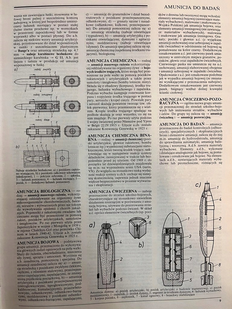 Współczesna broń charakteryzuje się wyższą efektywnością w porównaniu do broni dawnej. Dominującą rolę w tym okresie odgrywa broń palna, a zanika zupełnie broń ochronna, oraz broń biała z wyjątkiem lancy i szabli w kawalerii, które przetrwały do XX w. Zaczęły powstawać nowe rodzaje broni: czołgi, samoloty, broń chemiczna, broń biologiczna, rakietowa, broń masowego rażenia. Połowę XIX w. przyjęto jako początek okresu współczesnego w którym wprowadzono karabiny odtylcowe strzelające nabojami zespolonymi (np. Dreyse wz.41) w miejsce odprzodowej kapiszonowej broni strzeleckiej. W tym samym czasie gładkolufowe, odprzodowe, spiżowe działa artyleryjskie powoli zastępowano bruzdowanymi, odtylcowymi działami staliwnymi, które strzelały wydłużonymi pociskami walcowymi. Zaczęto udoskonalać broń palną w celu zwiększenia jej szybkostrzelności, donośności, trwałości, manewrowości i niezawodności działania. W efekcie w końcu XIX w. doszło do upowszechnienia palnej szybkostrzelnej broni strzeleckiej oraz dalekonośnej broni artyleryjskiej. ENCYKLOPEDIA WSPÓŁCZESNEJ BRONI PALNEJ jest bogato ilustrowanym popularno - naukowym słownikiem znaczeniowym, przeznaczonym dla szerokiego grona czytelników interesujących się techniką wojskową, a szczególnie dla członków organizacji paramilitarnych, dziennikarzy, publicystów, wojskowych itp.