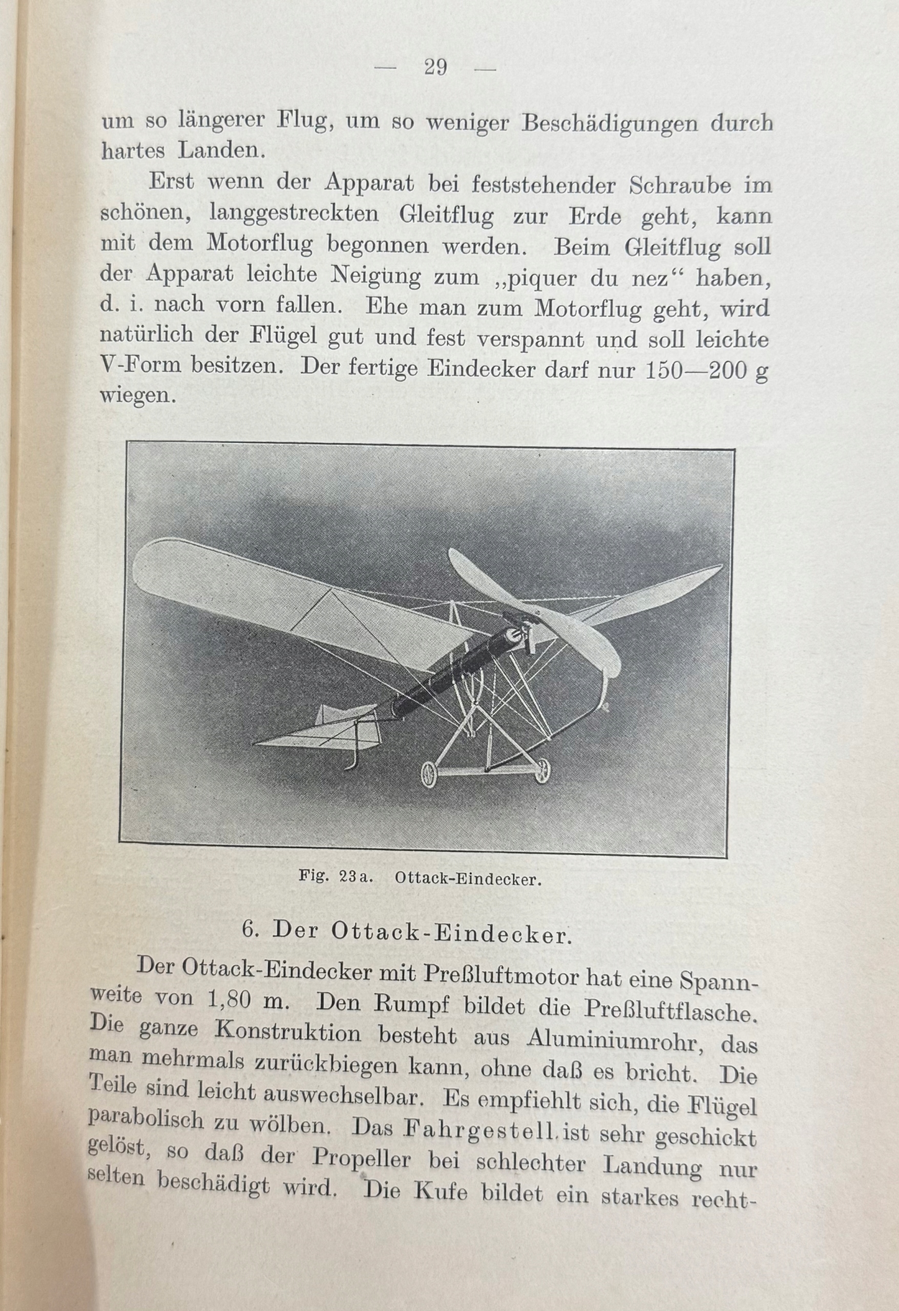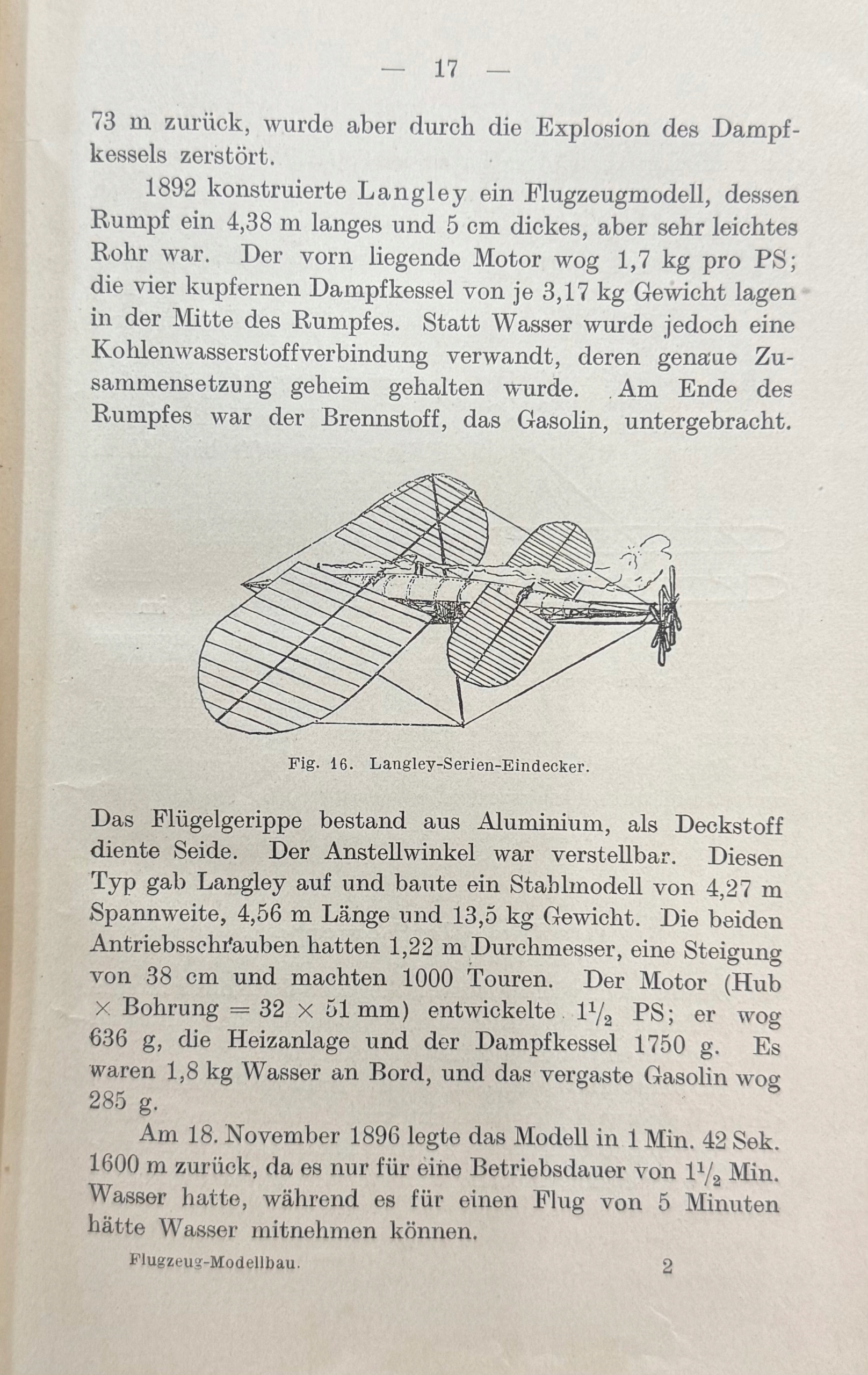 Książka w języku niemieckim, poświęcona budowie modeli samolotów w początkach lotnictwa. Autor omawia podstawy aerodynamiki, stosowane materiały i techniki konstrukcyjne oraz podaje praktyczne wskazówki dotyczące wykonywania modeli. Publikacja ukazuje stan wiedzy i rozwoju techniki lotniczej tuż przed I wojną światową i należy do najwcześniejszych podręczników modelarstwa lotniczego.