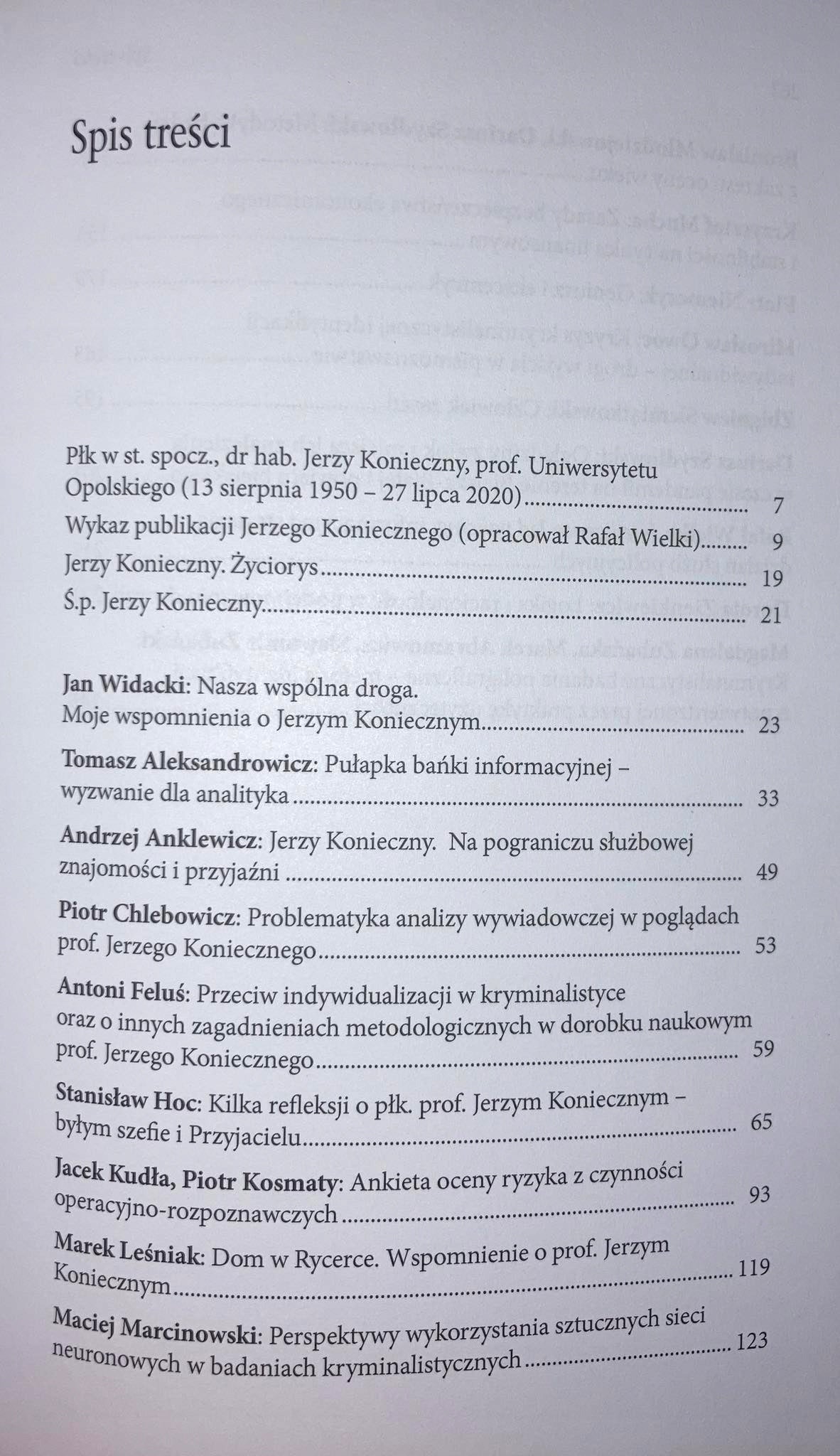 Płk w st. spocz., dr hab. Jerzy Konieczny, prof. Uniwersytetu Opolskiego (13 sierpnia 1950 – 27 lipca 2020) Po ukończeniu chemii na Wydziale Matematyki, Fizyki i Chemii Uniwersytetu Śląskiego w Katowicach i uzyskaniu tytułu magistra (w zakresie chemii) zatrudnił się w Zakładzie Kryminalistyki na Wydziale Prawa i Administracji tegoż Uniwersytetu, na etacie technicznym. W 1979 roku, po uzyskaniu stopnia doktora na Uniwersytecie Wrocławskim (Ekspertyza dokumentów sporządzonych pismem ręcznym na papierach syntetycznych – promotor: doc. dr hab. Zdzisław Kegel), przeszedł na etat adiunkta. W 1990 roku, na podstawie pracy Pojęcie prawdopodobieństwa ze stanowiska procesu karnego i kryminalistyki, uzyskał stopień doktora habilitowanego nauk prawnych na Uniwersytecie Śląskim. W międzyczasie, po odbytych studiach zaocznych na Uniwersytecie Jagiellońskim, uzyskał tytuł magistra prawa. Obok pracy na Uniwersytecie Śląskim, w latach 1988–1989 był kierownikiem Zakładu Kryminalistyki Instytutu Ekspertyz Sądowych w Krakowie. Był jednym ze współzałożycieli Klubu Inteligencji Katolickiej w Katowicach, członkiem „Solidarności”. W sierpniu 1990 roku został szefem delegatury Urzędu Ochrony Państwa w Katowicach, a w 1991 roku zastępcą szefa urzędu. Przez okres, kiedy MSW kierował Antoni Macierewicz, odszedł z urzędu i został podsekretarzem stanu w Kancelarii Prezydenta RP Lecha Wałęsy. W czerwcu 1992 roku został szefem UOP. Z funkcji tej zrezygnował w grudniu 1993 roku. Założył wtedy firmę ochroniarsko-detektywistyczną Konsalnet. W 1995 roku objął na krótko tekę Ministra Spraw Wewnętrznych w gabinecie Józefa Oleksego. W 1997 roku bezskutecznie kandydował do Sejmu. Od tego momentu wycofał się z działalności politycznej, poświęcając swój czas pracy naukowej i biznesowi (wykaz Jego publikacji naukowych znajduje się na stronach 9–17). W tym czasie był również nauczycielem akademickim (profesorem uczelnianym) w Uczelni Łazarskiego w Warszawie, Krakowskiej Akademii im. Andrzeja Frycza Modrzewskiego, a później w Uniwersytecie Opolskim. Zmarł nagle 27 lipca 2020 roku. Jan Widacki
