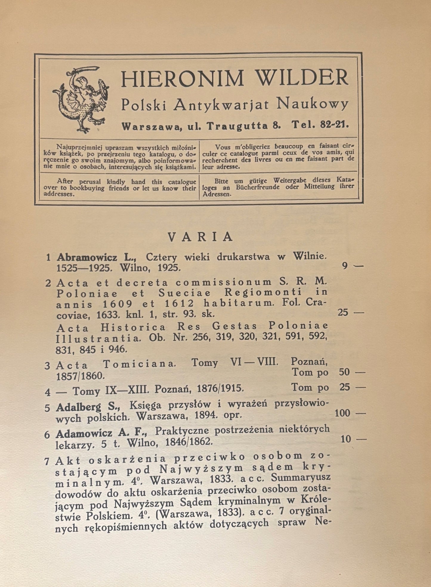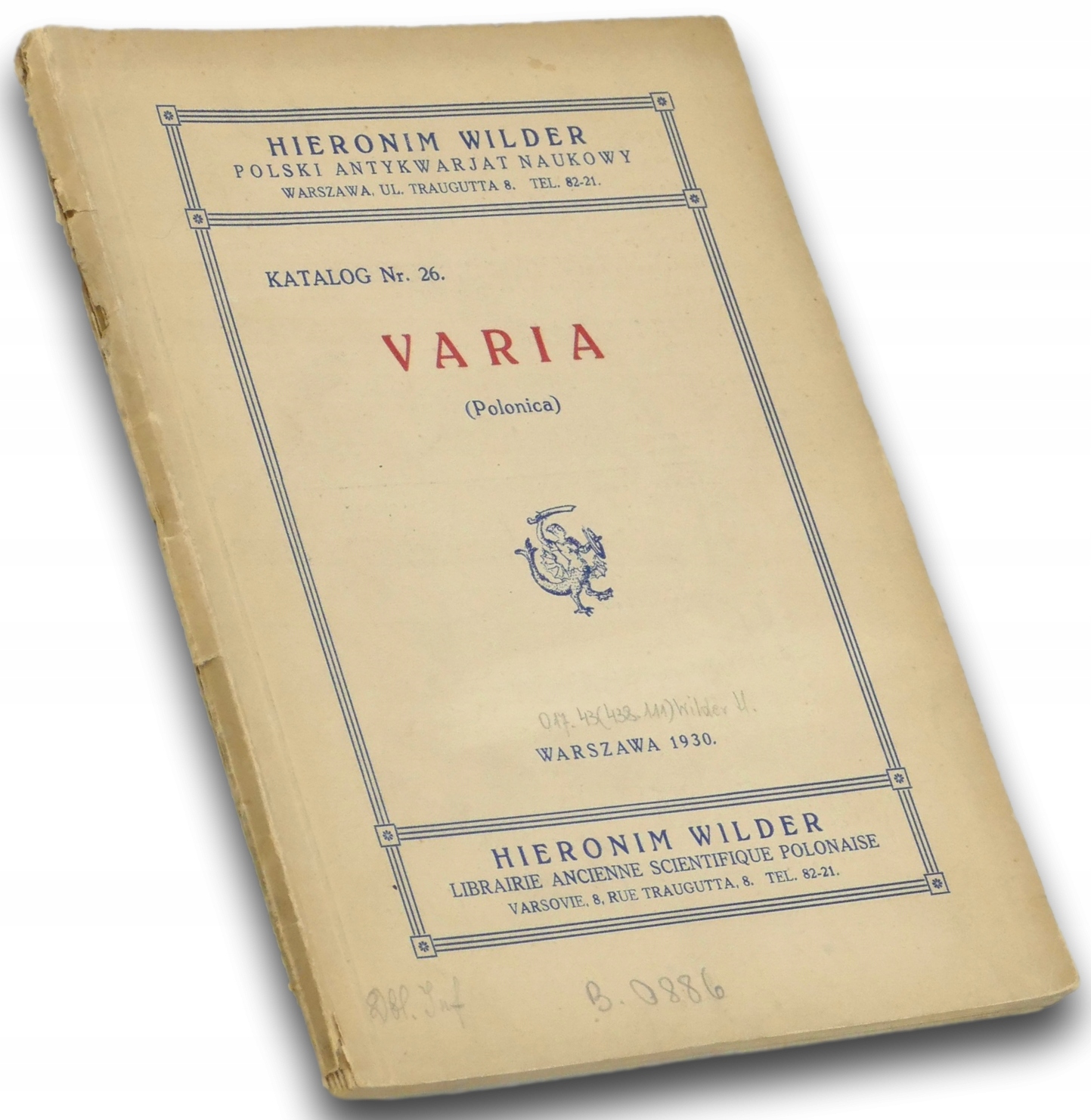 „Katalog Nr. 26. Varia (Polonica)” to publikacja Hieronima Wildera, wydana w Warszawie w 1930 roku jako jeden z kolejnych katalogów Antykwariatu Polskiego. Zawiera starannie opracowany spis poloniców – druków, książek i dokumentów związanych z Polską, przeznaczony dla kolekcjonerów, bibliotek i miłośników starych druków. Liczy 69 stron i został wydany w formacie około 16×22 cm w miękkiej oprawie. Katalogi Wildera cenione są za dokładne opisy, reprodukcje i wysoki poziom edytorski, a dziś stanowią cenne źródło dla badaczy historii książki, bibliofilów i osób interesujących się dawnym rynkiem antykwarycznym.