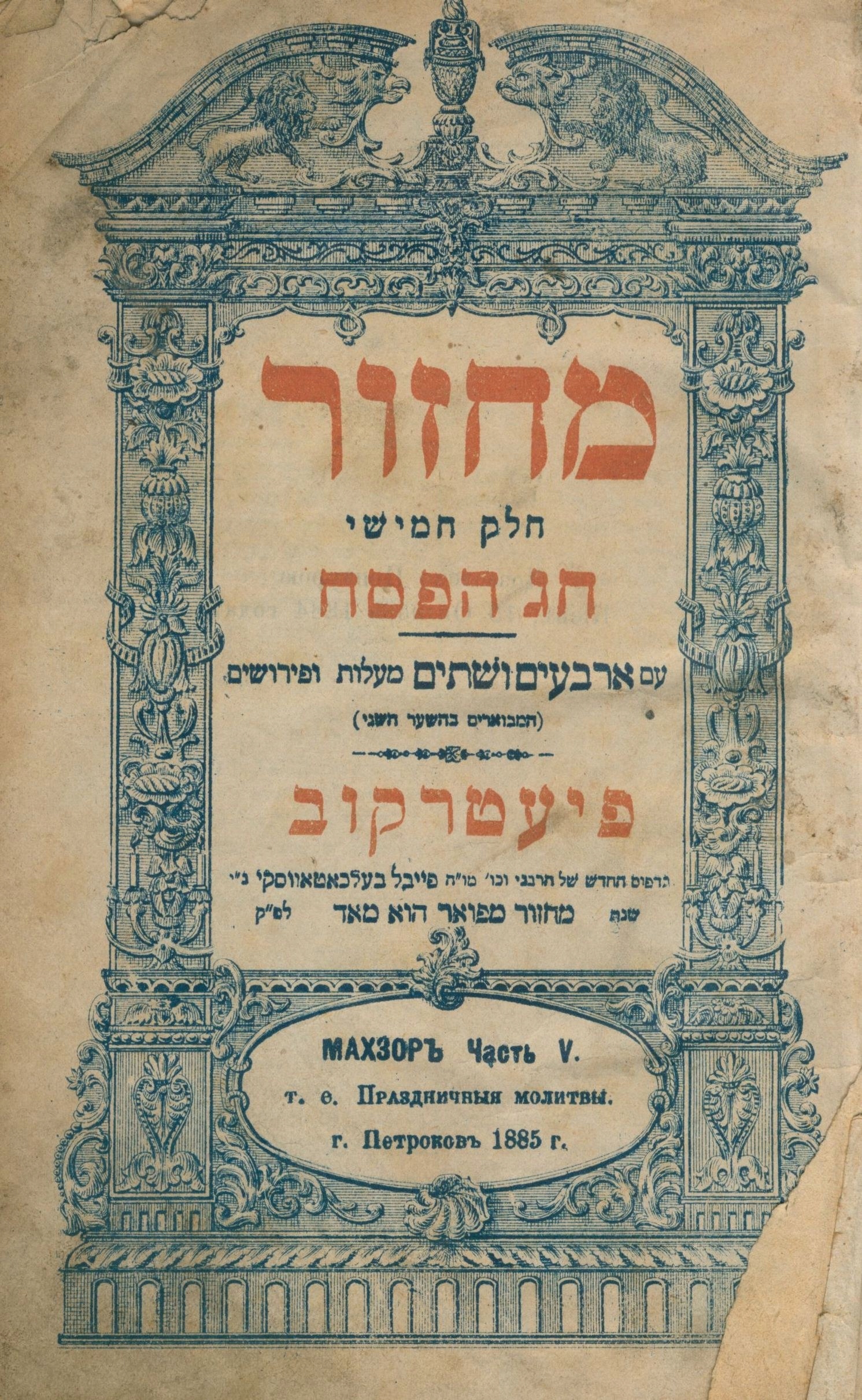 Machzor, część V na Święto Pesach według obrządku aszkenazyjskiego. Zawiera cztery pieśni, selichot (modlitwy pokutne) i pijutim (poematy liturgiczne). Wydane w roku żydowskim 5645, czyli w 1885.