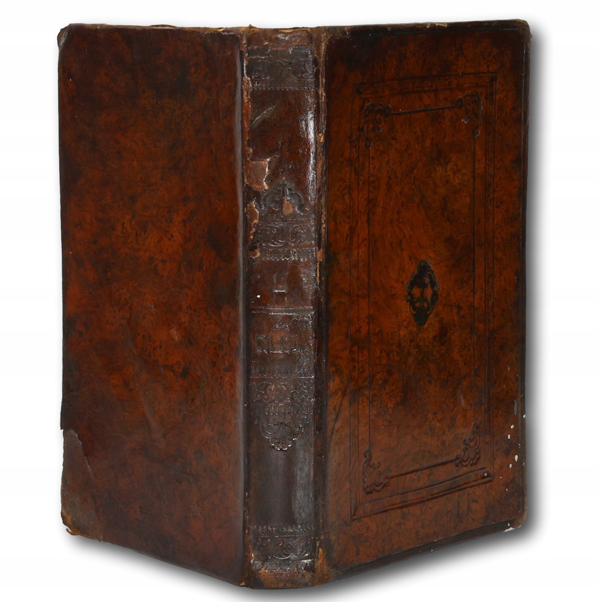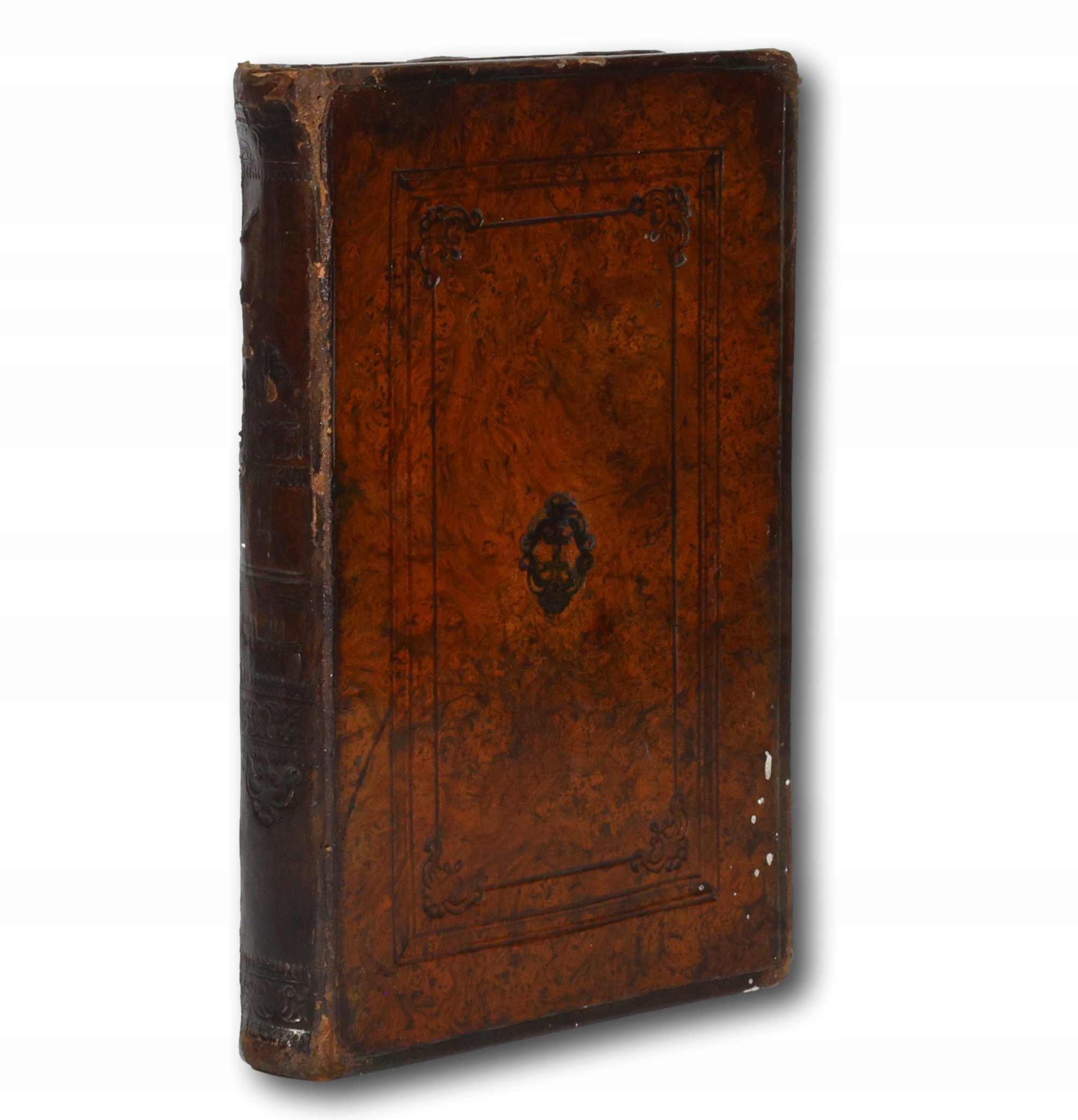 Oprawa introligatorska z epoki w skórę; ozdobne tłoczenia grzbiecie, jak i na przedniej okładce.