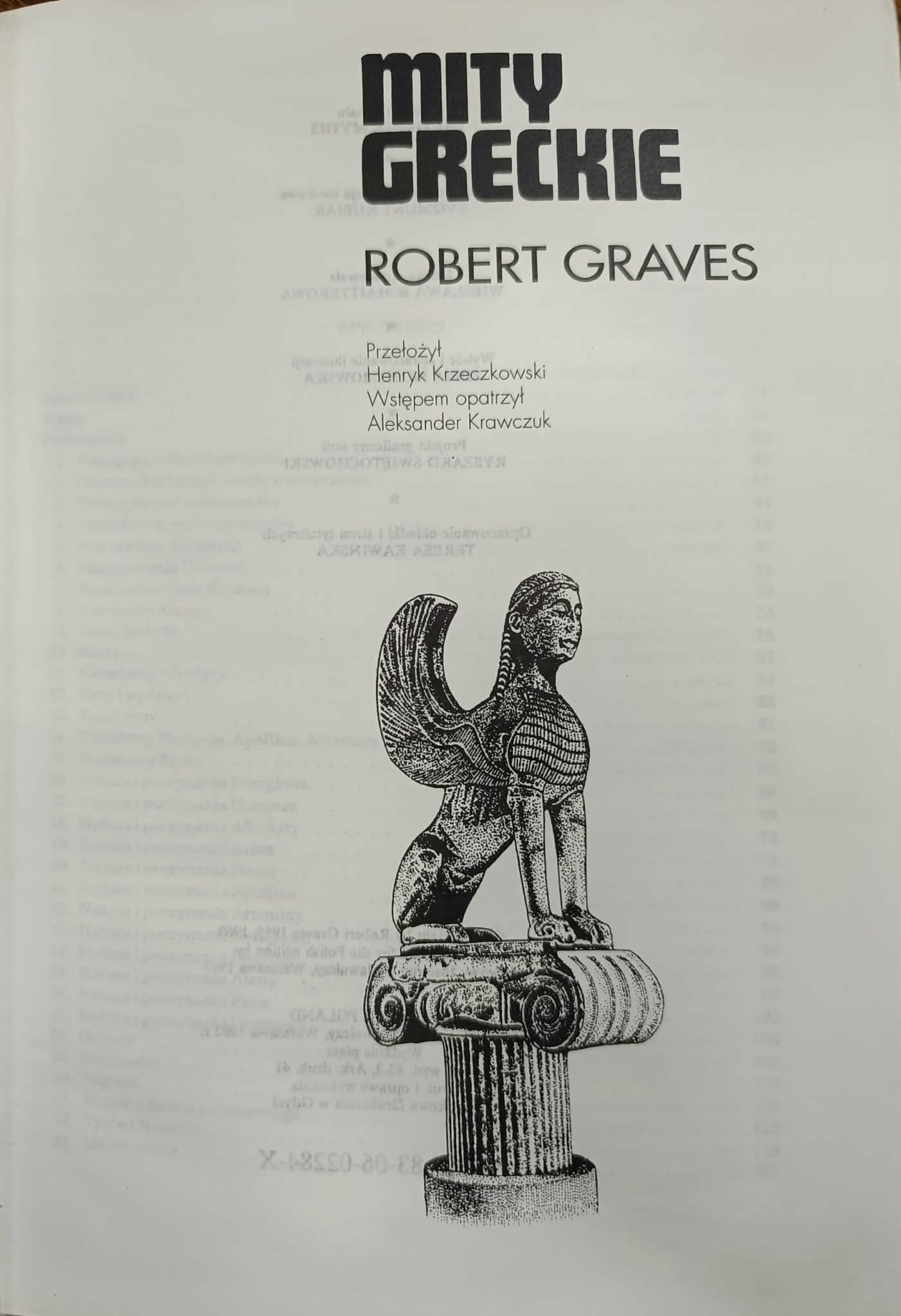 Mity greckie Roberta Gravesa (1895-1985) angielskiego pisarza (autora bestsellerowych powieści historycznych, między innymi Ja Kladiusz i Klaudiusz i Messalina),poety, historyka, kulturoznawcy - to do dzisiaj najlepsze, najpełniejsze i najciekawiej opracowane kompendium wiedzy o wierzeniach i kulturze starożytnych Greków.