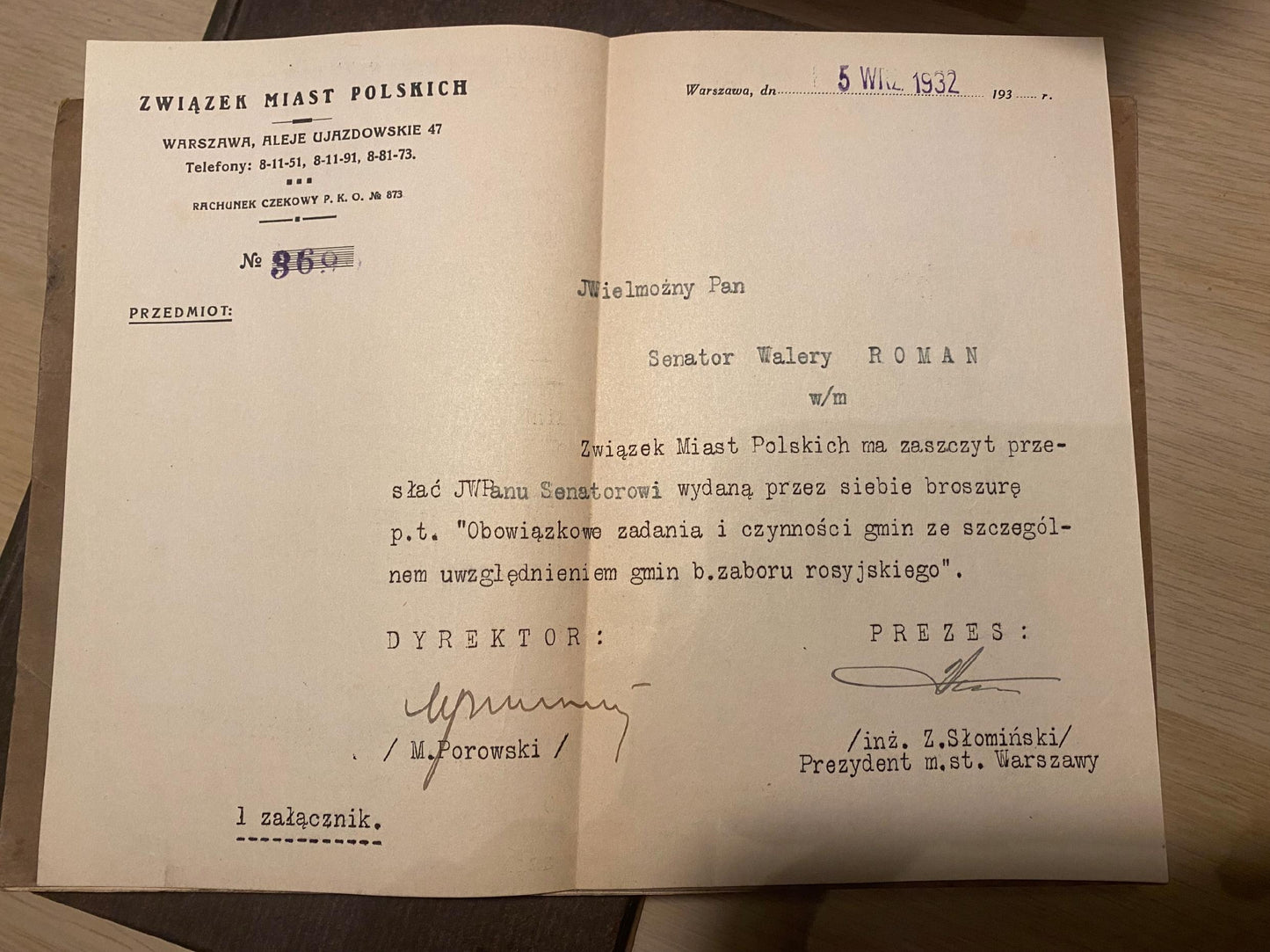 Dodatkowo: druk ulotny z 1932 roku od Związku Miast Polskich, informujący Senatora Walerego Romana o przesłaniu broszury „Obowiązkowe zadania i czynności gmin”.