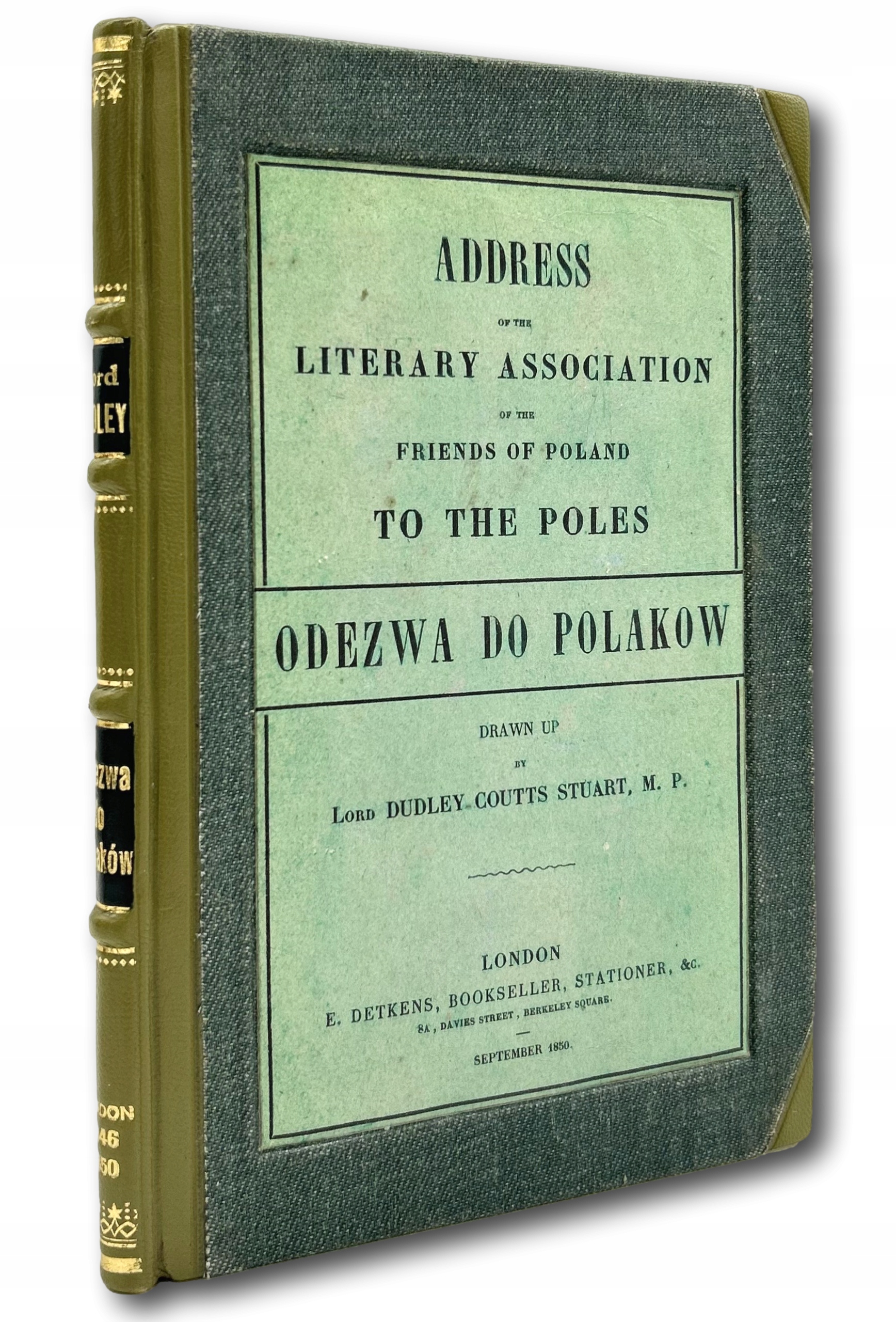Współczesna luksusowa oprawa introligatorska Marka Świdy. Zielony półskórek, pięciopolowy grzbiet ze zwięzami podkreślonymi podwójnymi złoconymi liniami (ciągła i kropkowana). W dwóch polach ciemnozielone szyldziki ze złoconą tytulaturą, w jednym z pól złocone miejsce i rok wydania. Na licach okładek płótno, na przedniej naklejona oryginalna okładka broszurowa (Odezwa do Polaków. Address of the Literary Association of the Friends of Poland to the Poles)/ na tylnej okładzinie tłoczony i złocony herb Pilawa Potockich, na wyklejce suchy tłok z herbem.