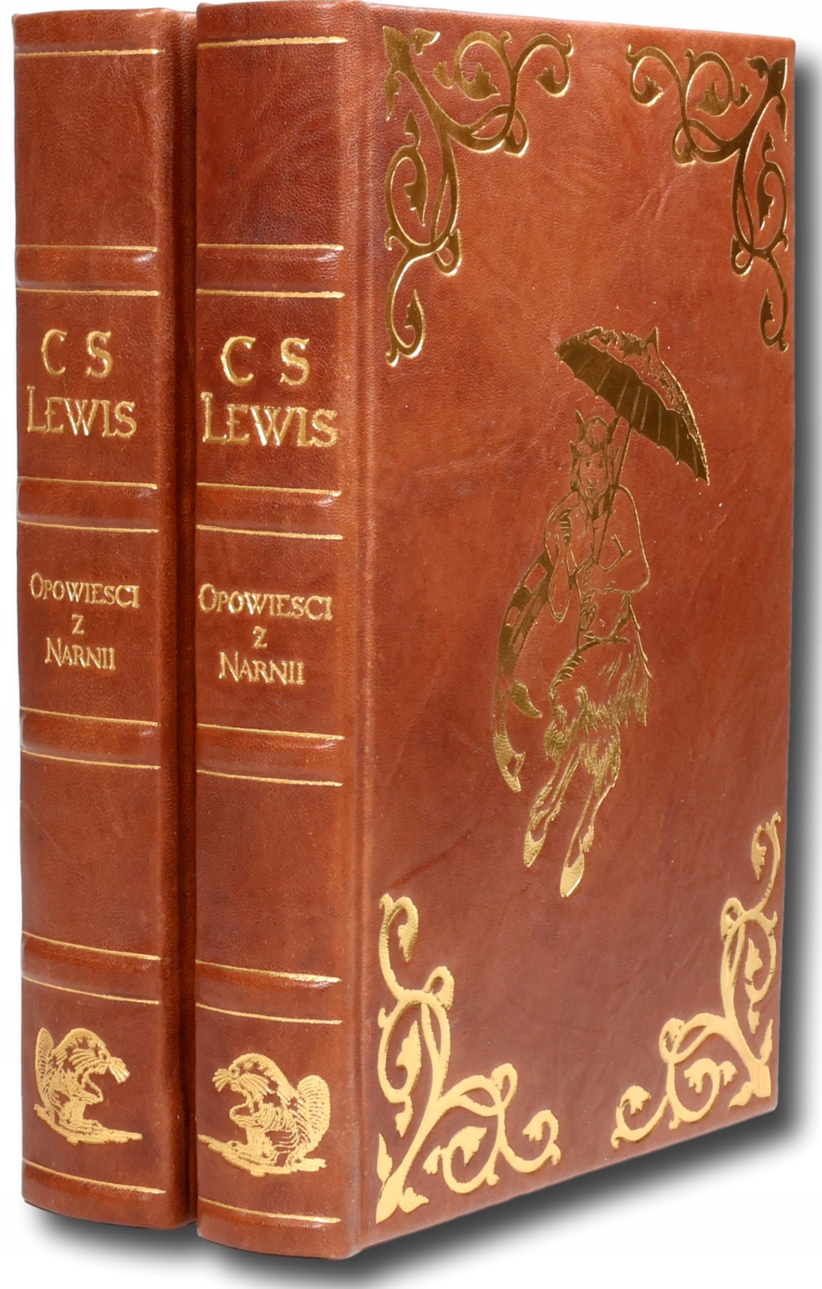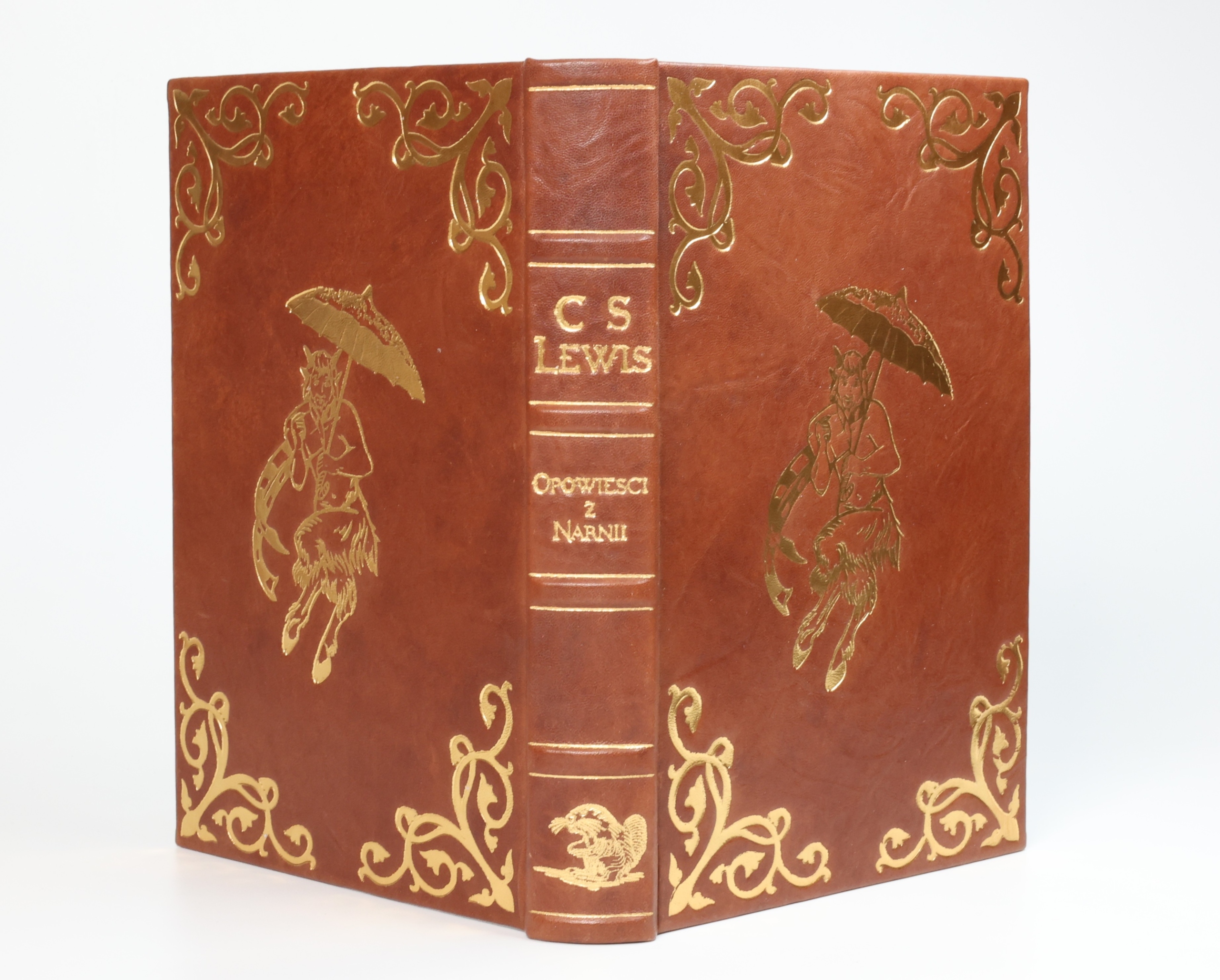 Artystycznie oprawiony egzemplarz w efektownej, skórzanej oprawie introligatorskiej. W obu zwierciadłach oprawy znajduje się przedstawienie Fauna Tumnusa, jednej z ważniejszych postaci świata wykreowanego przez autora; dookoła ramowo okalające akcenty floralne. Grzbiet pięciopolowy, z polami rozdzielonymi wypukłymi zwięzami podkreślonymi złotymi liniami; w jednym z pól złocona tytulatura, u samego dołu przedstawienie bobra, również kojarzone z fabułą. Całość dopełniają marmurkowe, ręcznie barwione wyklejki oraz barwione na ciemnoróżowo obcięcia kart.