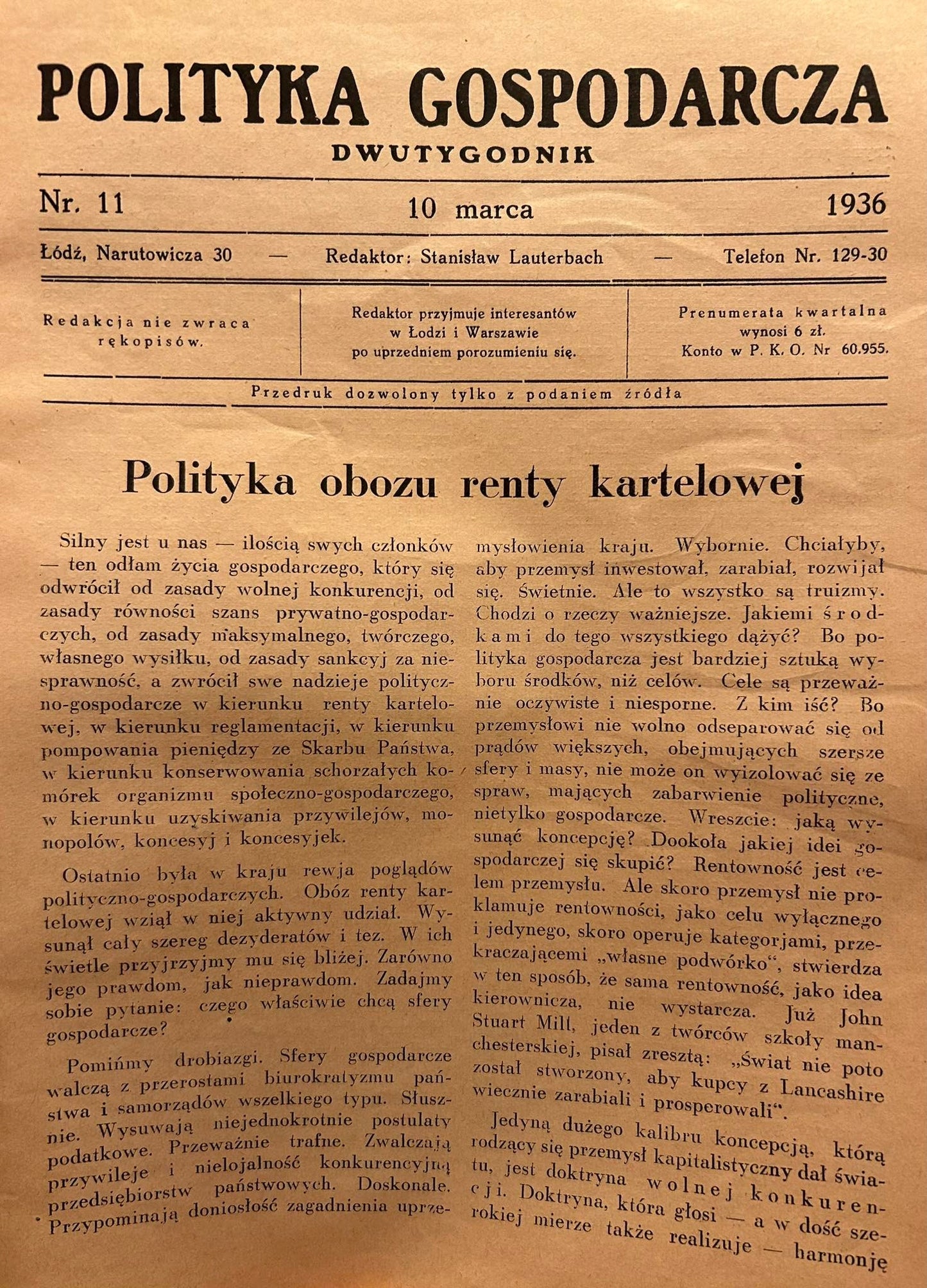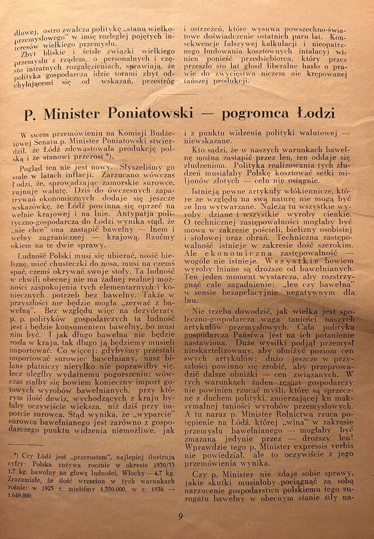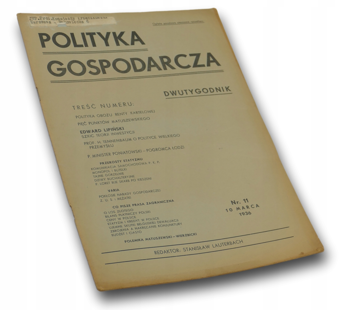 Ten numer zawiera m.in.: Polityka obozu renty kartelowej, Pięć punktów Matuszewskiego, Szkic teorji inwestycji (Edward Lipiński), Prof H. Tennenbaum o polityce wielkiego przemysłu, P. Minister Poniatowski - pogromca Łodzi, Przerosty etatyzmu