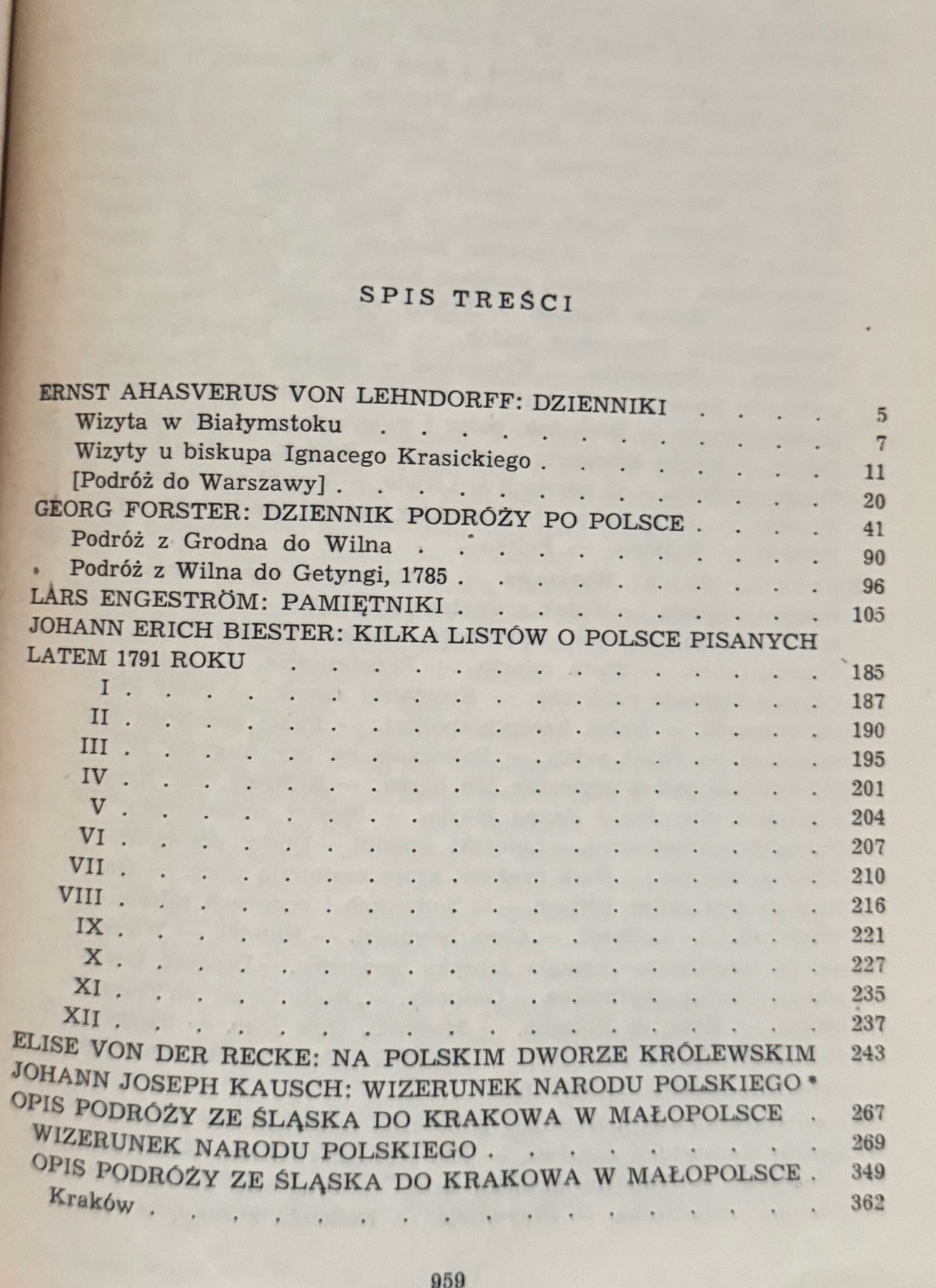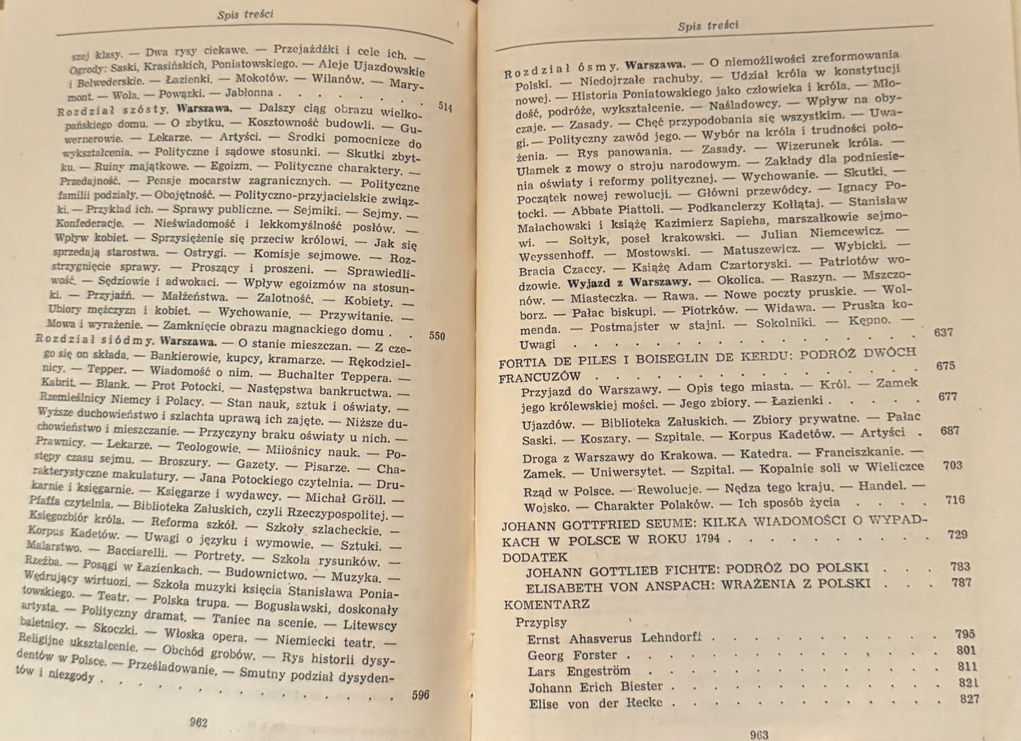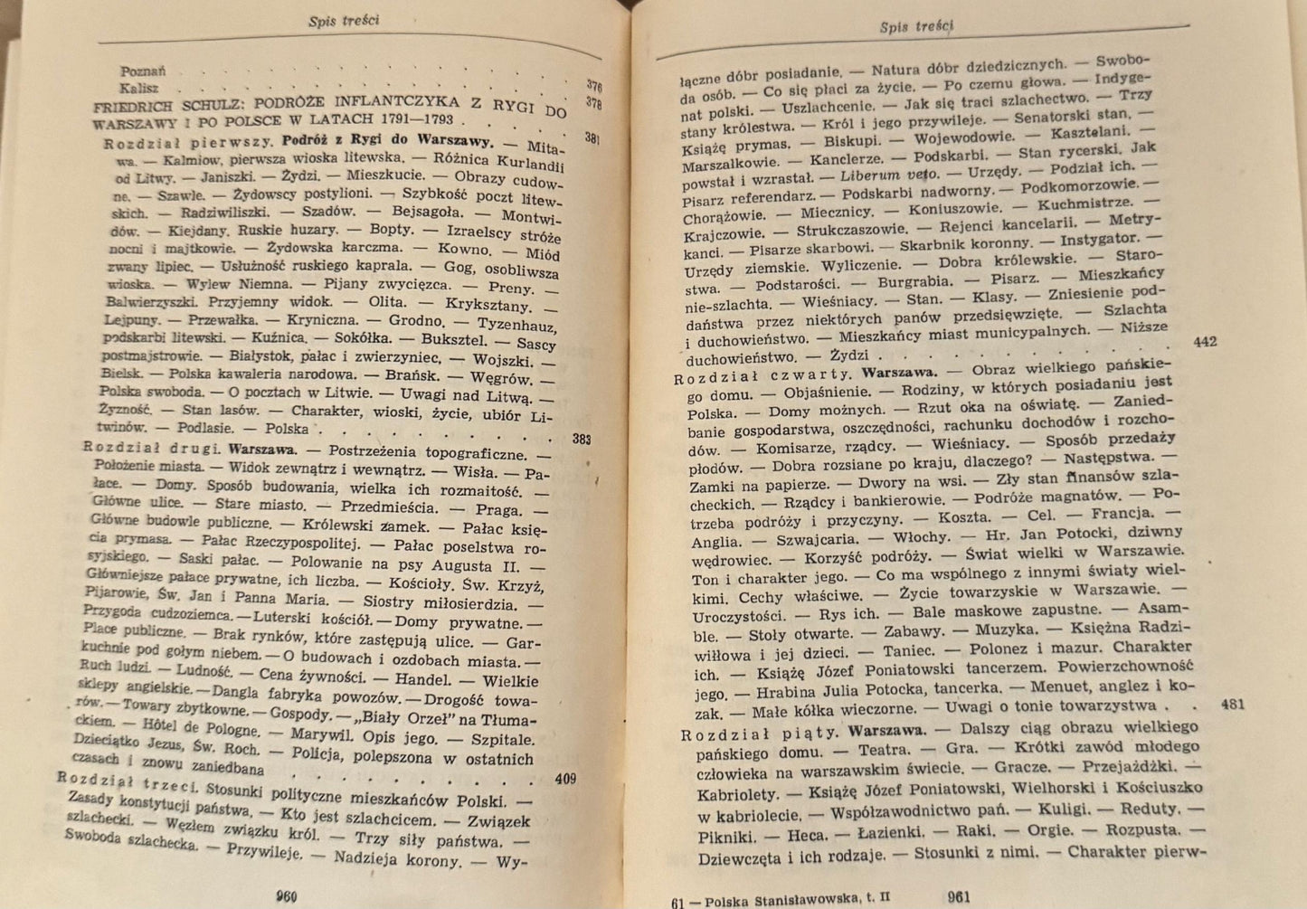 Relacje cudzoziemców, Niemców, Anglików, Francuzów, Szwajcarów, dyplomatów, kupców, uczonych, literatów o Polsce czasów Stanisława Augusta. Dzięki różnicy zainteresowań, uzdolnień, punktu widzenia, wykształcenia i ogólnej kultury autorów czytelnik otrzymuje niezwykle wszechstronny i bogaty obraz tej ważnej, a tak barwnej epoki: świetny dwór królewski i kurne chaty chłopskie, pałace magnackie i żydowskie zajazdy, życie wsi, miast prowincjonalnych i Warszawy przekształcającej się w nowoczesną stolicę, wielkoświatowe plotki i doniosłe sprawy ustrojowe, konfederacja barska i Sejm Czteroletni, rozbiory i powstanie kościuszkowskie. Ogromna większość tekstów ukazuje się po raz pierwszy po polsku. Spośród 20 autorów wymieńmy m. in. Bernardin de St.-Pierre'a, Fichtego, Casanovę...