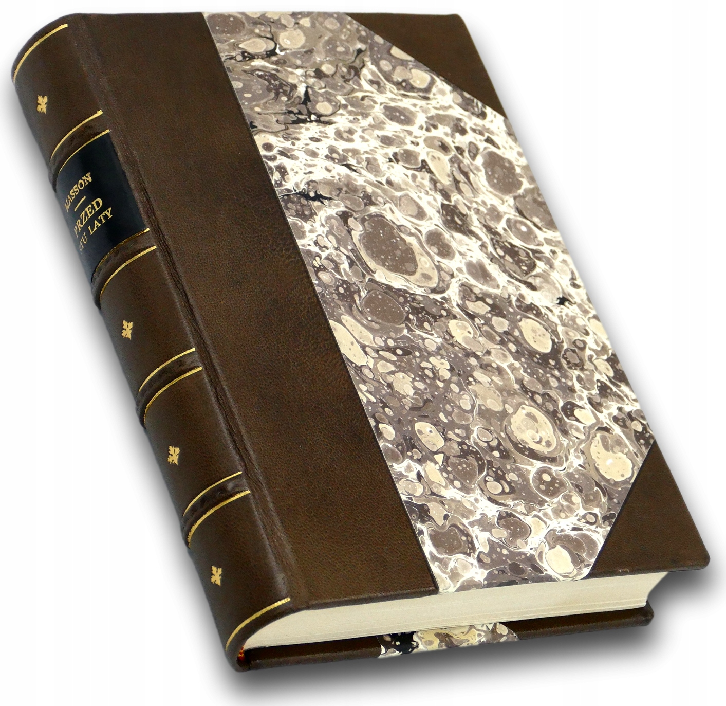 Oprawa: artystyczna w półskórek / pięciopolowy grzbiet ze złoconą tytulaturą w drugim polu / okładki obłożone papierem marmurkowym / barwione górne obcięcia kart