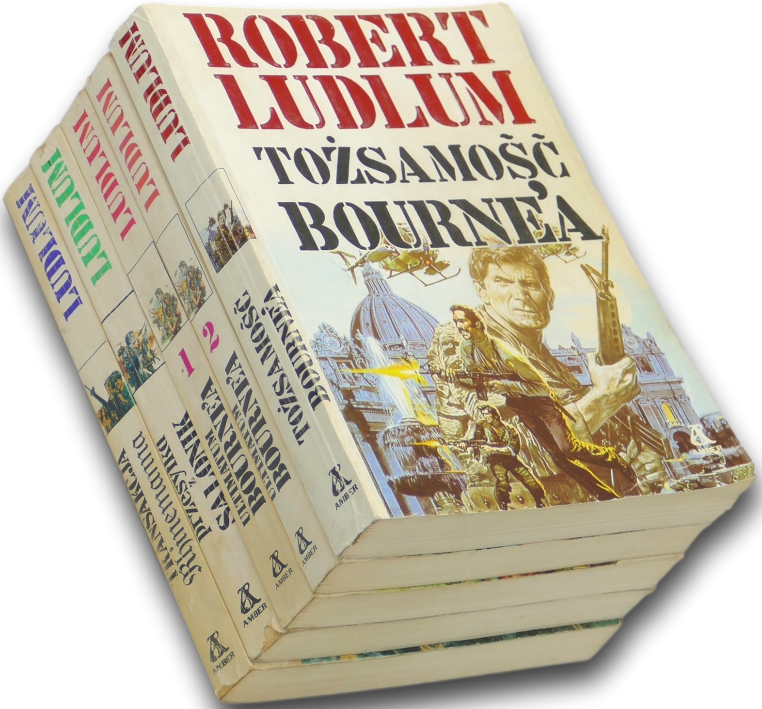 Stan: dobry / przetarcia i przybrudzenia na okładkach / lekkie zagięcia rogów i krawędzi okładek / wystrzępienia krawędzi grzbietów okładek / zagniecenia grzbietów okładek / małe nadarcie tylnej oprawy i składki luzem tomu Tożsamość Bourne'a / lekkie przybrudzenia obcięć kart