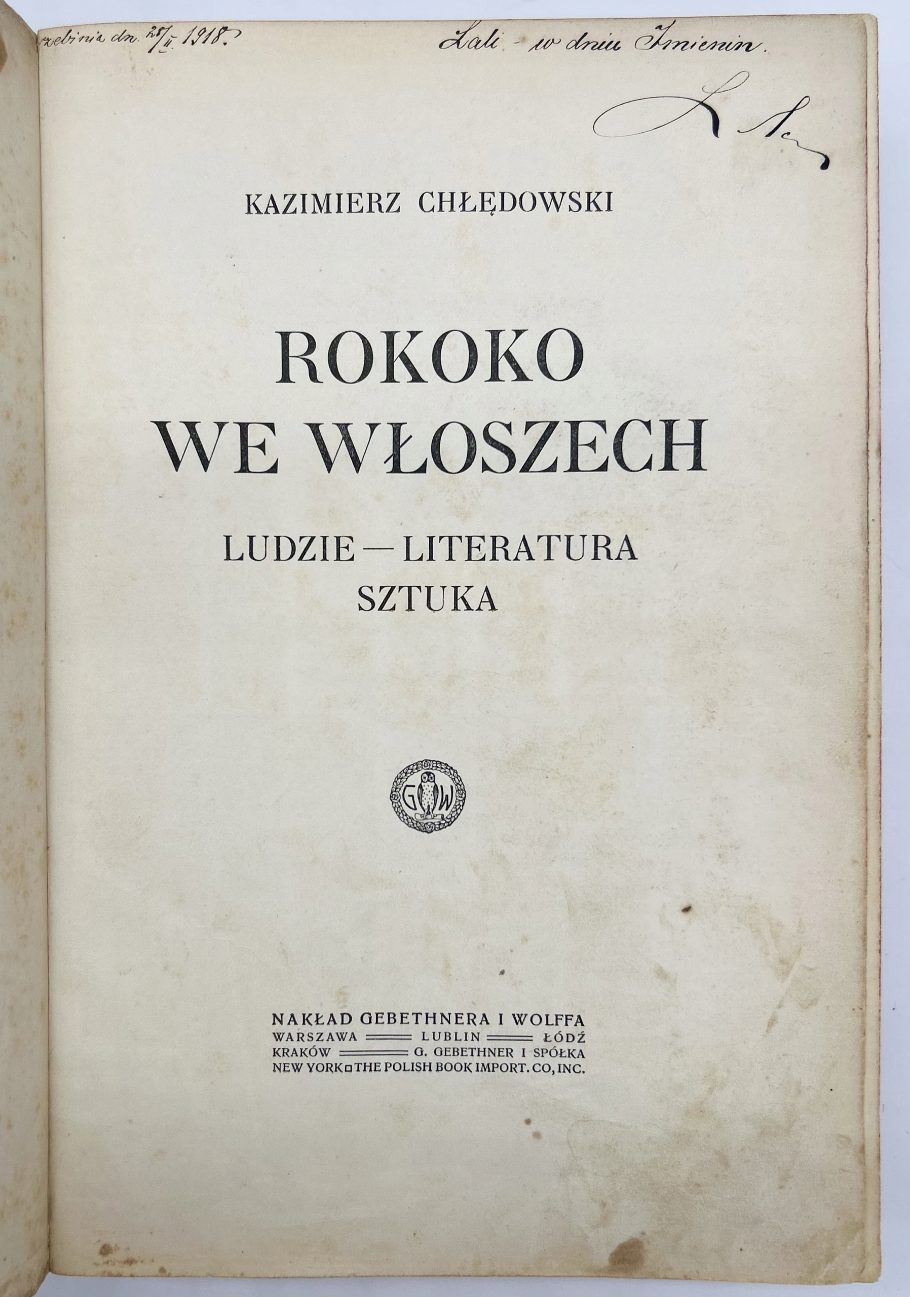 Pierwsze wydanie monografii Kazimierza Chłędowskiego dotyczącej kultury XVIII-ego wieku we Włoszech. Zawiera m.in.: Przewodnie prądy; Rococo w Wenecyi; Bracia Gozzi; Casanova; Rzym w drugiej połowie XVIII wieku; Artyści w Rzymie; Lord Byron we Włoszech. Kazimierz Chłędowski (1843-1920) - pisarz polski, pamiętnikarz, badacz kultury, satyryk, historyk kultury, gawędziarz, popularyzator kultury włoskiej, urzędnik monarchii austro-węgierskiej. Wysoko cenione są jego pamiętniki z lat 1843-1901, a także prace z historii kultury. Przekazał w nich efekt swoich wieloletnich badań muzealnych i archiwalnych we Włoszech, opisując problemy religijne, polityczne, kulturalne, literackie i naukowe Italii od XV do XVIII wieku.