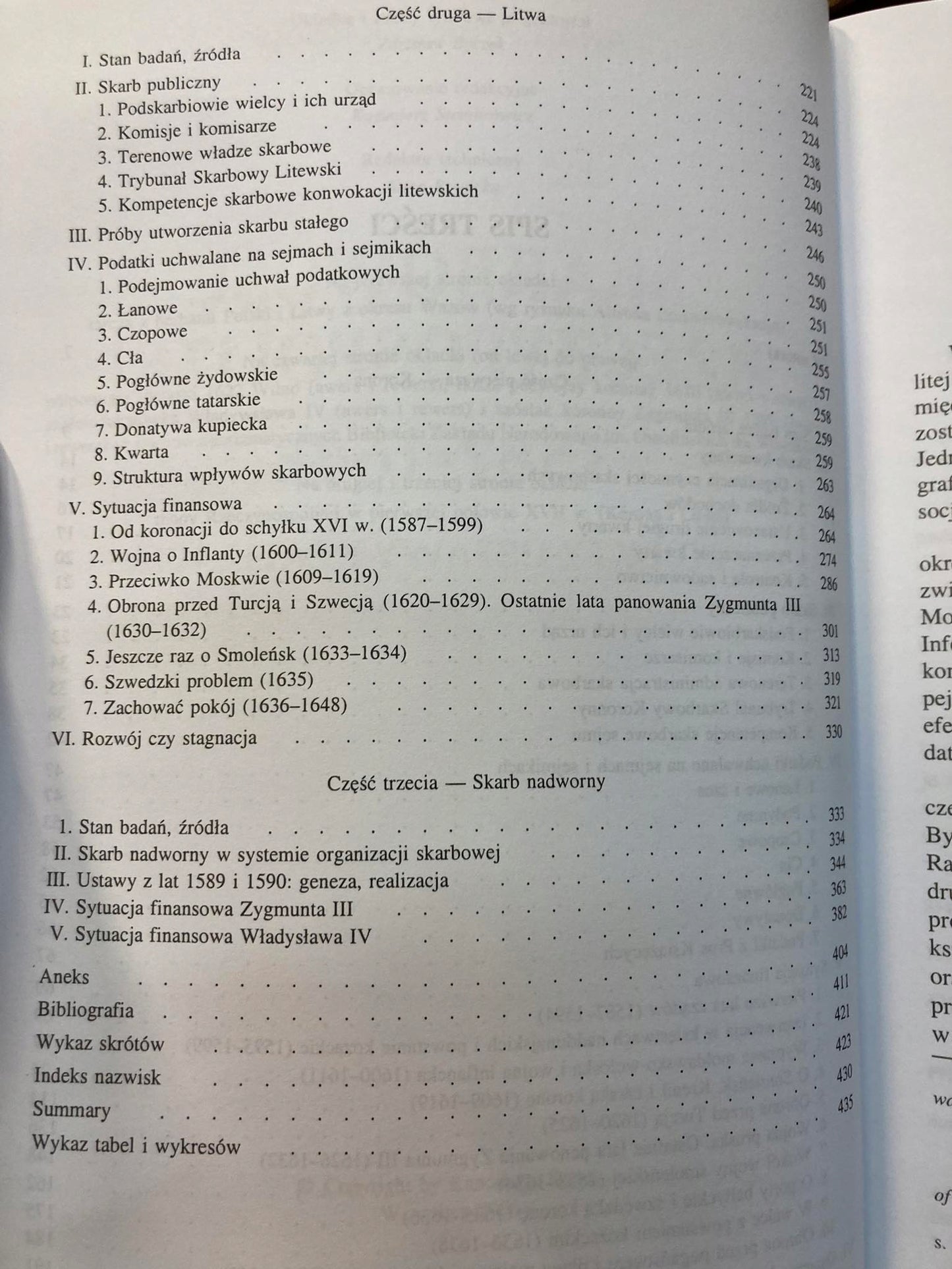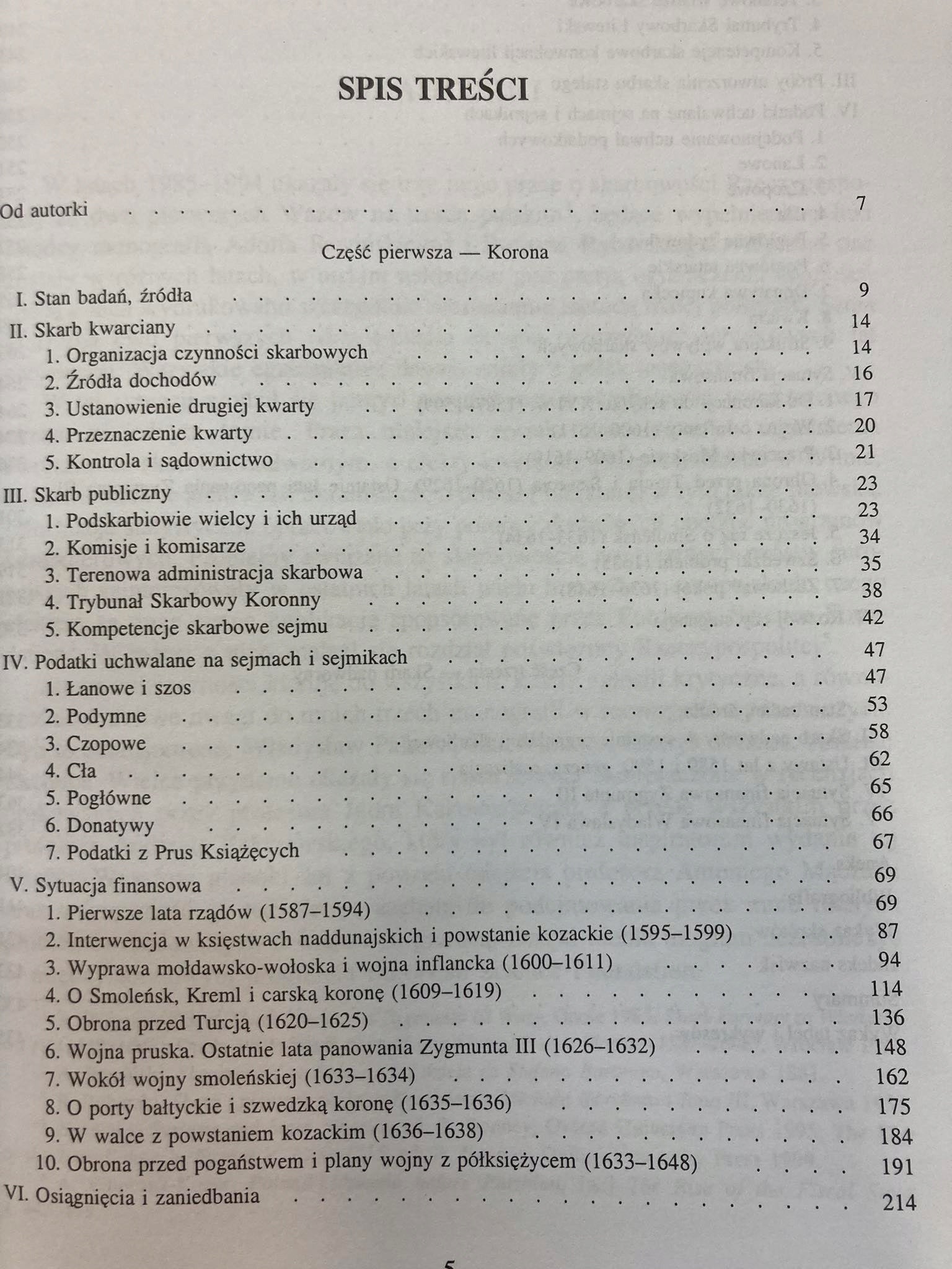 Stanowi syntezę skarbowości za panowania dwóch pierwszych Wazów na tronie Rzeczypospolitej – Zygmunta III i Władysława IV – w latach 1587–1648. Autorka omawia system skarbowy w kontekście wydarzeń politycznych, relacje między skarbem państwowym a królewskim, kompetencje urzędników i sądów skarbowych, dochody i wydatki Rzeczypospolitej oraz prywatne obu monarchów. Książka zawiera cenne dane statystyczne opracowane w formie tabel i wykresów, wiele miejsca poświęca debatom sejmowym, w czasie których decydowano o finansach państwa.