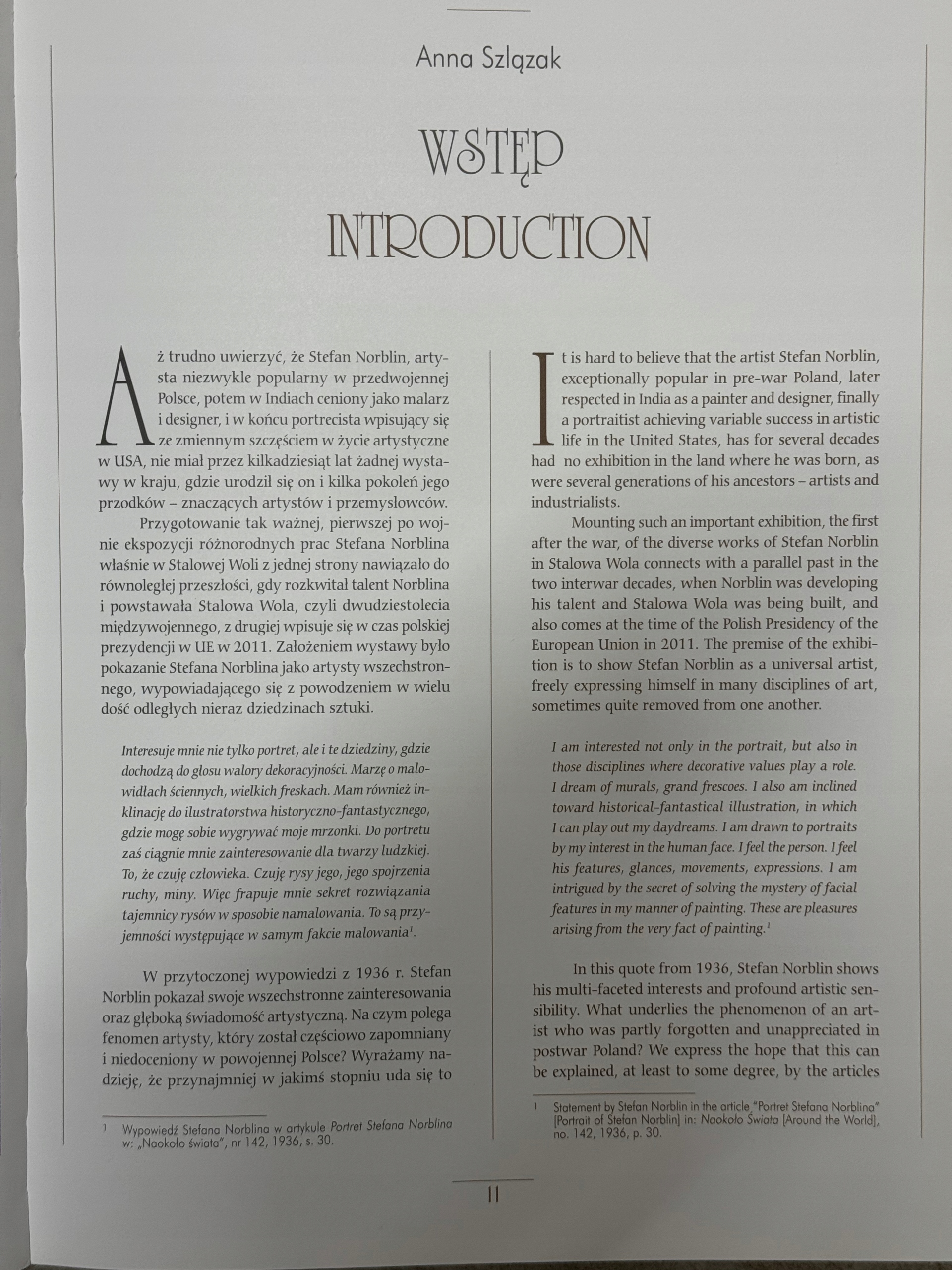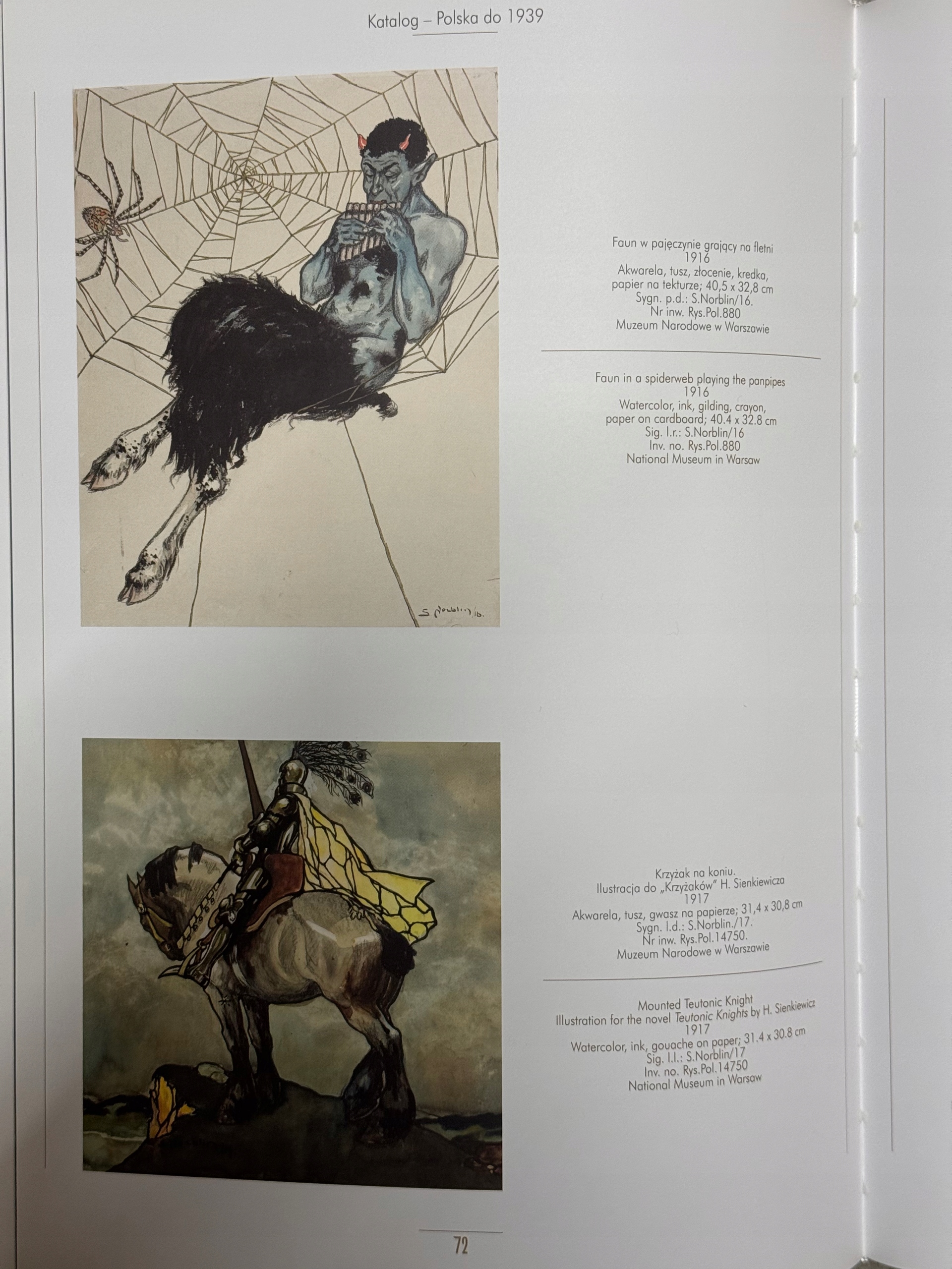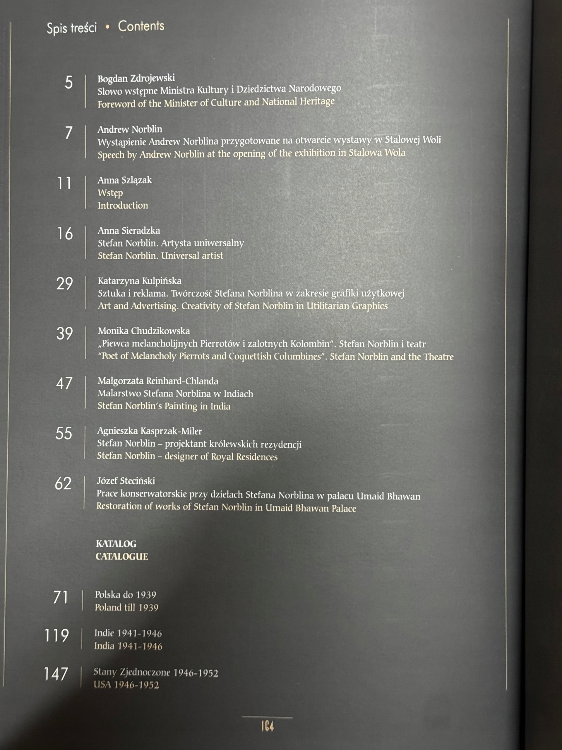 W katalogu znajdują się artykuły omawiające biografię i poszczególne dziedziny twórczości artysty, a także fotografie prac i zdjęcia z archiwum rodzinnego. Drugie wydanie dodatkowo zawiera w części wstępnej wystąpienie syna artysty, Andrew Norblina, przygotowane na otwarcie wystawy, natomiast w części katalogowej znalazła się niepublikowana w I edycji akwarela, przedstawiająca Józefa Potockiego na polowaniu w Sudanie i obszerna nota katalogowa. Całość tekstu w dwóch językach: polskim i angielskim.