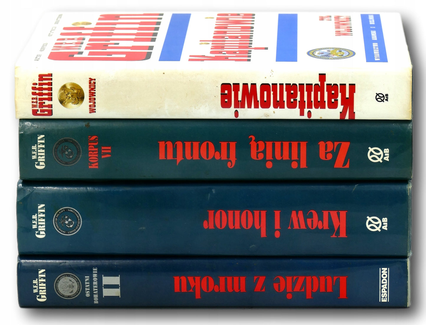 W.E.B. Griffin, właściwie William Edmund Butterworth III, był amerykańskim pisarzem znanym z licznych serii powieści sensacyjnych i wojennych. Cztery wymienione tytuły należą do różnych cykli jego twórczości: 1. “Ludzie z mroku” To drugi tom serii Ostatni bohaterowie (ang. Men at War), która skupia się na działaniach amerykańskiego wywiadu podczas II wojny światowej. Powieść przedstawia losy agentów Office of Strategic Services (OSS) zaangażowanych w tajne operacje na różnych frontach konfliktu. 2. “Kapitanowie” Druga część cyklu Braterstwo broni (ang. The Brotherhood of War), opisującego kariery oficerów Armii Stanów Zjednoczonych od zakończenia II wojny światowej do lat 60. XX wieku. Książka koncentruje się na wyzwaniach i doświadczeniach młodych kapitanów w powojennym świecie. 3. “Krew i honor” Drugi tom serii Więzy honoru (ang. Honor Bound), której akcja toczy się w Argentynie podczas II wojny światowej. Powieść opowiada o tajnych misjach i intrygach związanych z działalnością wywiadowczą w Ameryce Południowej. 4. “Za linią frontu” Siódma część cyklu Korpus (ang. The Corps), skupiającego się na losach żołnierzy Korpusu Piechoty Morskiej USA podczas II wojny światowej i wojny koreańskiej. W tej odsłonie bohaterowie angażują się w operacje wywiadowcze i bojowe za liniami wroga. Powieści W.E.B. Griffina charakteryzują się realistycznym przedstawieniem życia wojskowego, szczegółowymi opisami operacji militarnych oraz złożonymi portretami psychologicznymi postaci. Jego twórczość cieszy się uznaniem wśród miłośników literatury wojennej i sensacyjnej.