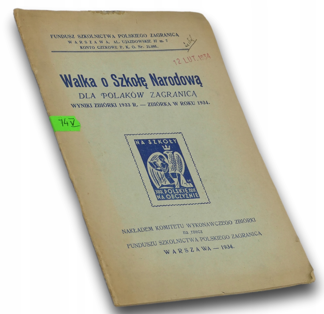 Tytuł: Walka o Szkołę Narodową dla Polaków zagranicą. Wyniki zbiórki 1933 r. - Zbiórka w roku 1934
