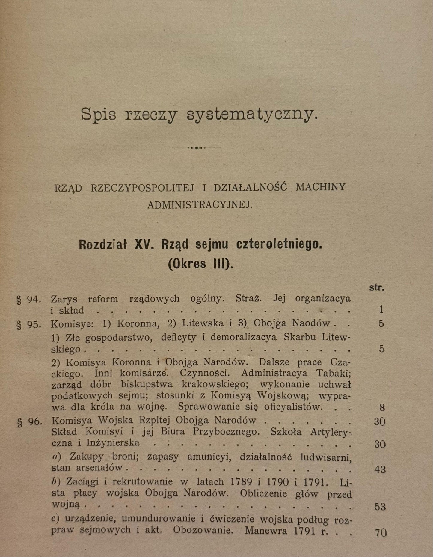 Tom V monumentalnego dzieła Tadeusza Korzona koncentruje się na przełomowym okresie Sejmu Czteroletniego oraz wydarzeniach prowadzących do upadku Rzeczypospolitej. W rozdziale XV autor analizuje działania reformatorskie parlamentu w latach 1788–1792, ze szczególnym uwzględnieniem reform administracyjnych, skarbowych i wojskowych. Rozdział XVI poświęcony jest dramatycznym przewrotom politycznym – konfederacji targowickiej, wojnie z Rosją i obaleniu Konstytucji 3 maja.