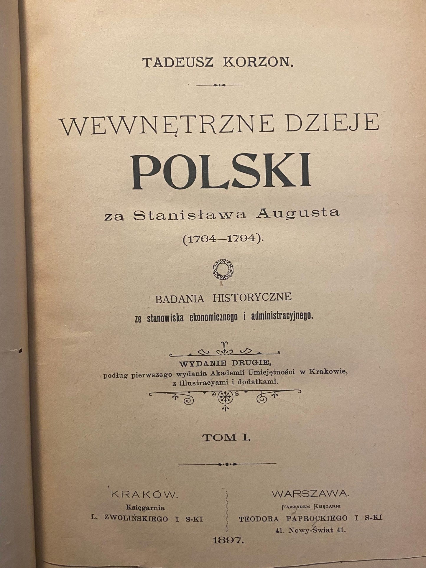 Wewnętrzne dzieje Polski za Stanisława Augusta. Tom 1 autorstwa Tadeusza Korzona to jedno z najważniejszych dzieł polskiej historiografii końca XIX wieku, poświęcone analizie wewnętrznej sytuacji Rzeczypospolitej w czasach panowania ostatniego króla – Stanisława Augusta Poniatowskiego. Opublikowane w 1897 roku przez Akademię Umiejętności w Krakowie, dzieło otwiera wielotomowe opracowanie ukazujące życie polityczne, gospodarcze, społeczne i kulturalne Polski drugiej połowy XVIII wieku.