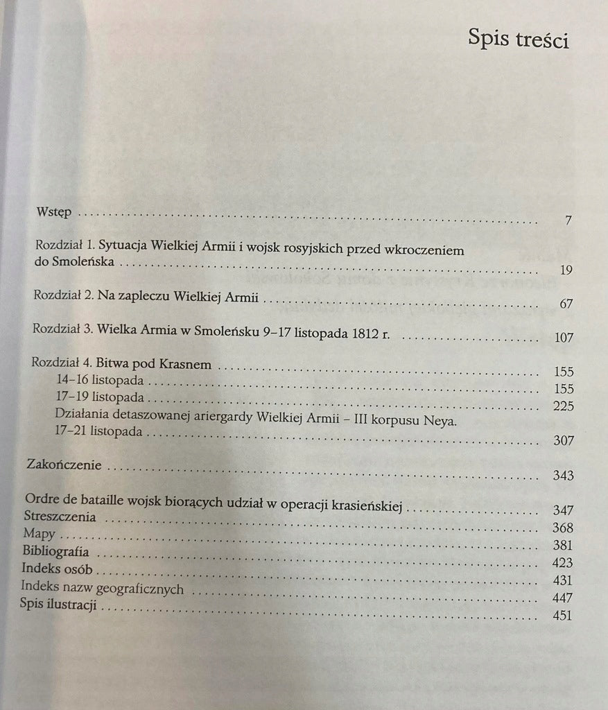 Bitwa pod Krasnem - największa bitwa w czasie odwrotu Wielkiej Armii z Rosji – nie doczekała się dotychczas monograficznego opracowania. Operacje pod Krasnem ukazują krwawe starcia obydwu walczących stron: napoleońskiej i rosyjskiej, w listopadowe dni roku 1812. Batalia pod Krasnem, nazwana przez ówczesnych „dniem bohaterów”, to ciemna plama wojny roku 1812 tak dla Rosjan, jak i Francuzów. Obydwie strony nie chciały się tą rozprawą chlubić. Z jednej strony dwuznaczna postawa Kutuzowa, który właśnie w trakcie tej bitwy ,,zbudował” dla Wielkiej Armii słynne ,,złote mosty”, z drugiej Napoleon – autor bitwy - swoimi decyzjami spowodował, że wydarzenia pod Krasnem stały się najbardziej krwawą i najokrutniejszą rozprawą podczas odwrotu. Zapomniana bitwa Napoleona.