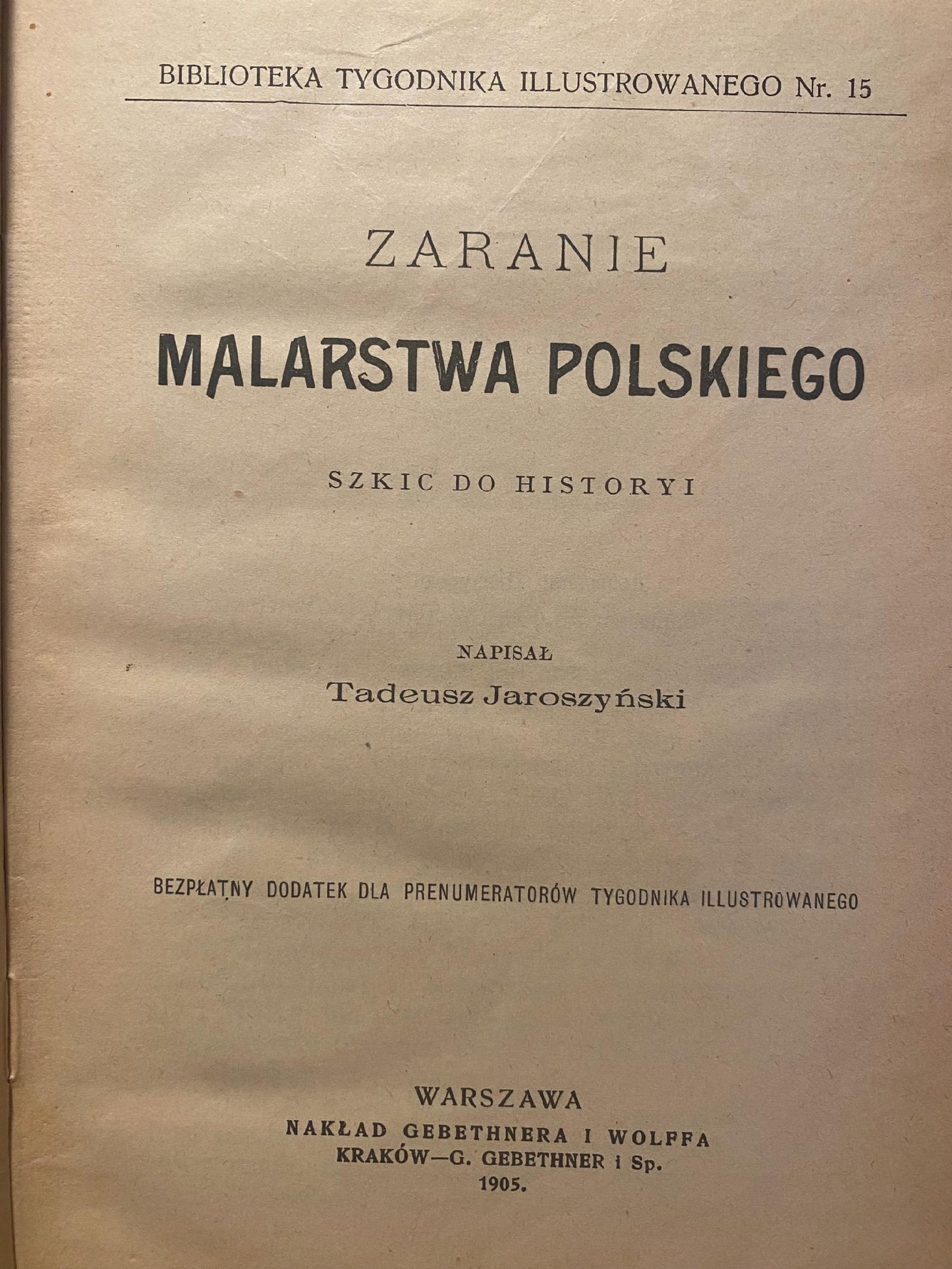 Książka „Zaranie malarstwa polskiego: szkic do historyi” autorstwa Tadeusza Jaroszyńskiego, wydana w 1905 roku przez Gebethnera i Wolffa jako 15. tom serii „Biblioteka Tygodnika Ilustrowanego”, stanowi próbę rekonstrukcji początków malarstwa polskiego. Autor analizuje rozwój tej dziedziny sztuki od XIII do XVII wieku, przybliżając czytelnikom najwcześniejsze przejawy twórczości malarskiej na ziemiach polskich. Publikacja ta jest cenna dla badaczy historii sztuki, oferując wgląd w genezę i ewolucję malarstwa w Polsce.