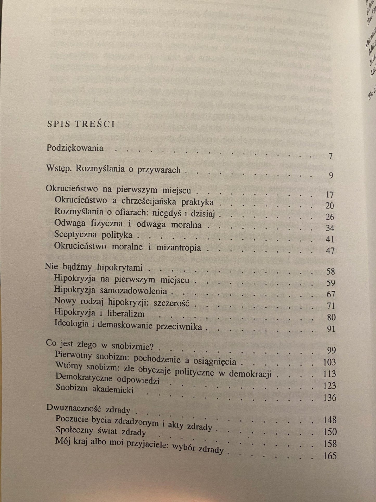 Na książkę składają się eseje poświęcone analizie okrucieństwa, zdrady, snobizmu, mizantropii i hipokryzji. Shklar, odwołując się do przeszłości, z uwagą śledzi, jak sobie radzi z tymi występkami współczesne społeczeństwo.