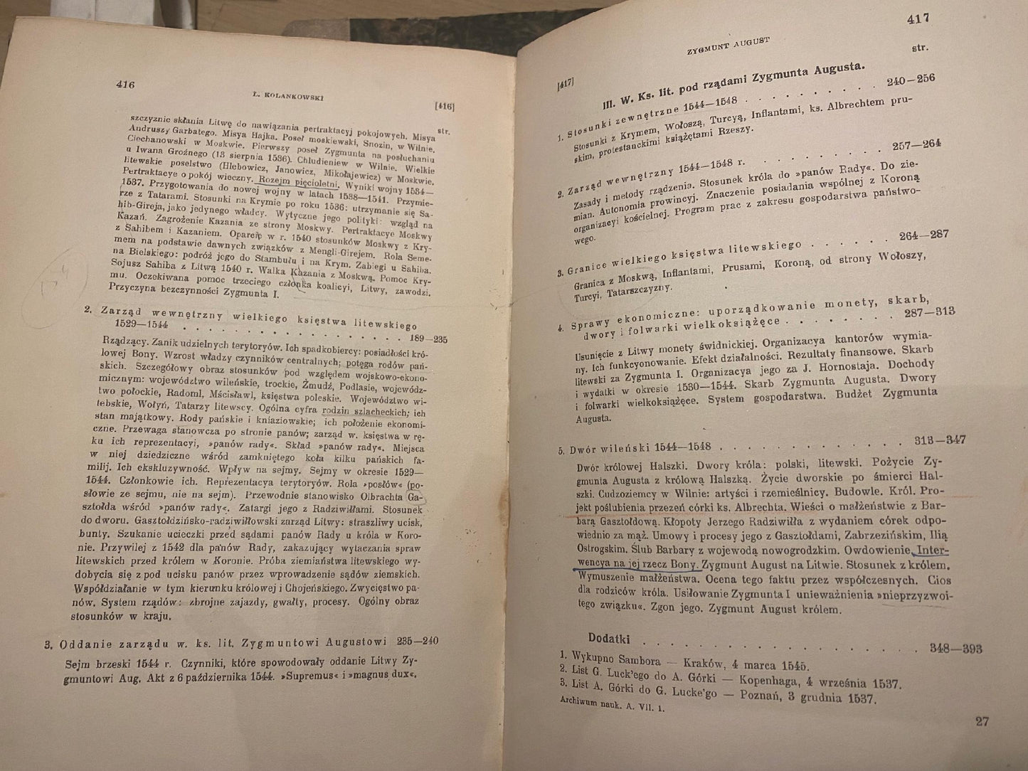 “Zygmunt August. Wielki Książę Litwy do roku 1548” autorstwa Ludwika Kolankowskiego, wydana w 1913 roku przez Stowarzyszenie dla Popierania Życia Uniwersalnego, to szczegółowa monografia poświęcona młodości Zygmunta Augusta oraz jego rządom na Litwie przed objęciem tronu polskiego. Kolankowski, opierając się głównie na materiałach rękopiśmiennych, w tym na Metryce Litewskiej przechowywanej w Moskwie, analizuje polityczne, społeczne i gospodarcze aspekty Wielkiego Księstwa Litewskiego w latach 1530–1548. Praca ta jest cenna dla badaczy historii Jagiellonów i stosunków polsko-litewskich w XVI wieku.