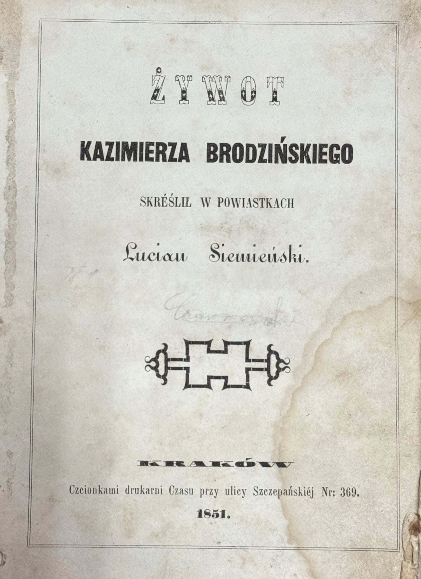 Biograficzne opracowanie życia i działalności Kazimierza Brodzińskiego autorstwa Lucjana Siemieńskiego, wydane w 1851 roku przez Drukarnię „Czas”. Książka oprawiona introligatorsko, w półpłócienną oprawę z marmurkowym papierem na okładkach. Cenne źródło wiedzy o jednym z czołowych przedstawicieli polskiego romantyzmu.